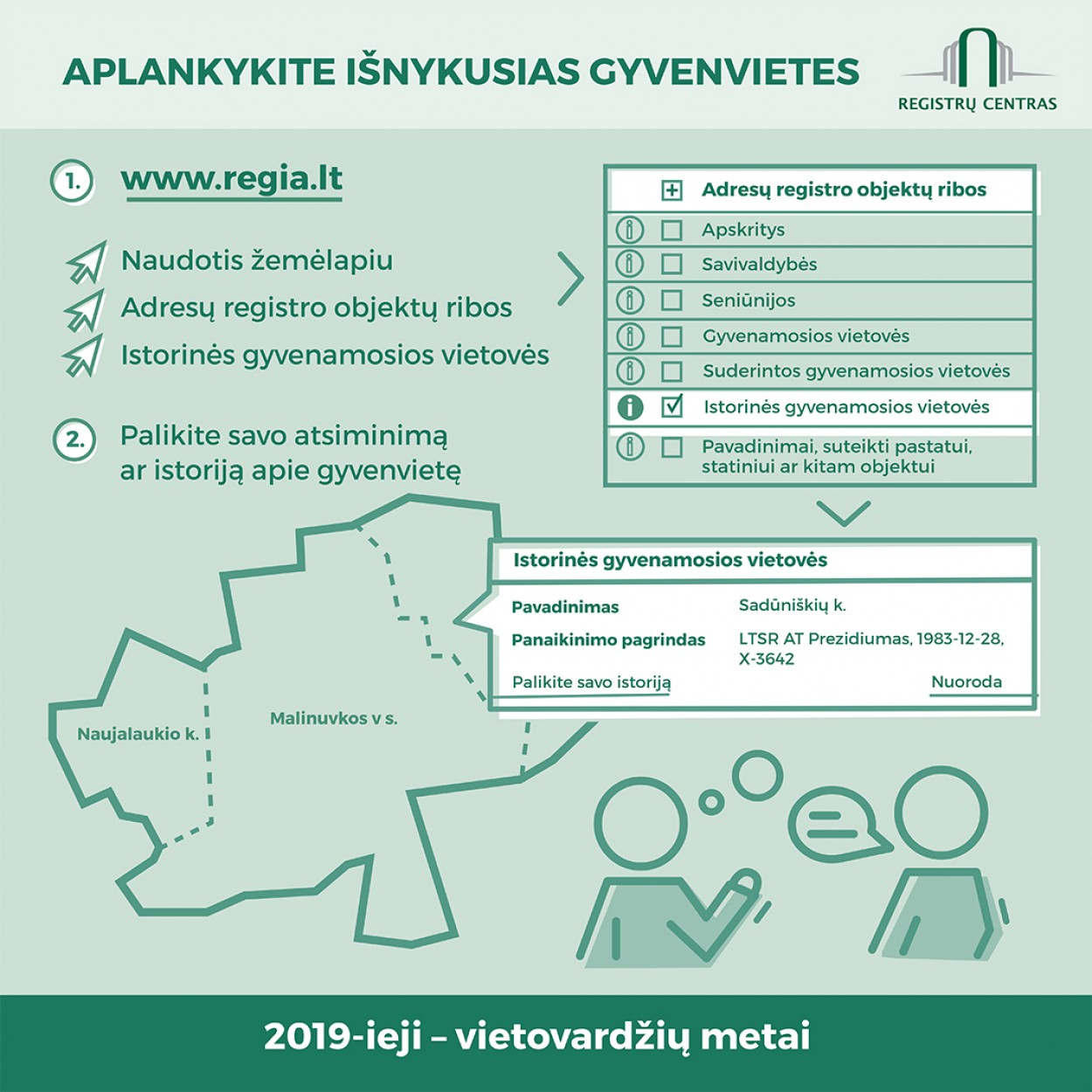 Tęsdamas didžiulio susidomėjimo sulaukusį Vietovardžių metams skirtą projektą ir atsižvelgdamas į visuomenės poreikį, Registrų centras sudarė interaktyvią galimybę REGIA žemėlapyje suradus išnykusias tėvų, senelių ar prosenelių gimtąsias vietas - palikti savo prisiminimus, istorijas, pasidalinti vaizdine informacija.