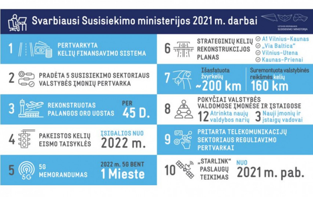 „Metai buvo kupini iššūkių, bet taip pat atvėrė ir nemažai galimybių. Stengėmės dėmesį skirti daugeliui sričių ir džiugu, kad išties pavyko nemažai nuveikti sėkmingai atnaujinant susisiekimo infrastruktūrą, dedant pagrindą atviresnei ir skaidresnei valstybės įmonių veiklai, pertvarkant kelių finansavimo sistemą ir įstatymiškai bei praktiškai atveriant kelius naujausioms technologijoms – 5G, palydovinio ryšio paslaugoms. Tai tik dalis darbų ir pradžia tų, kuriuos tęsime kitais metais“, – sako susisiekimo ministras Marius Skuodis.
