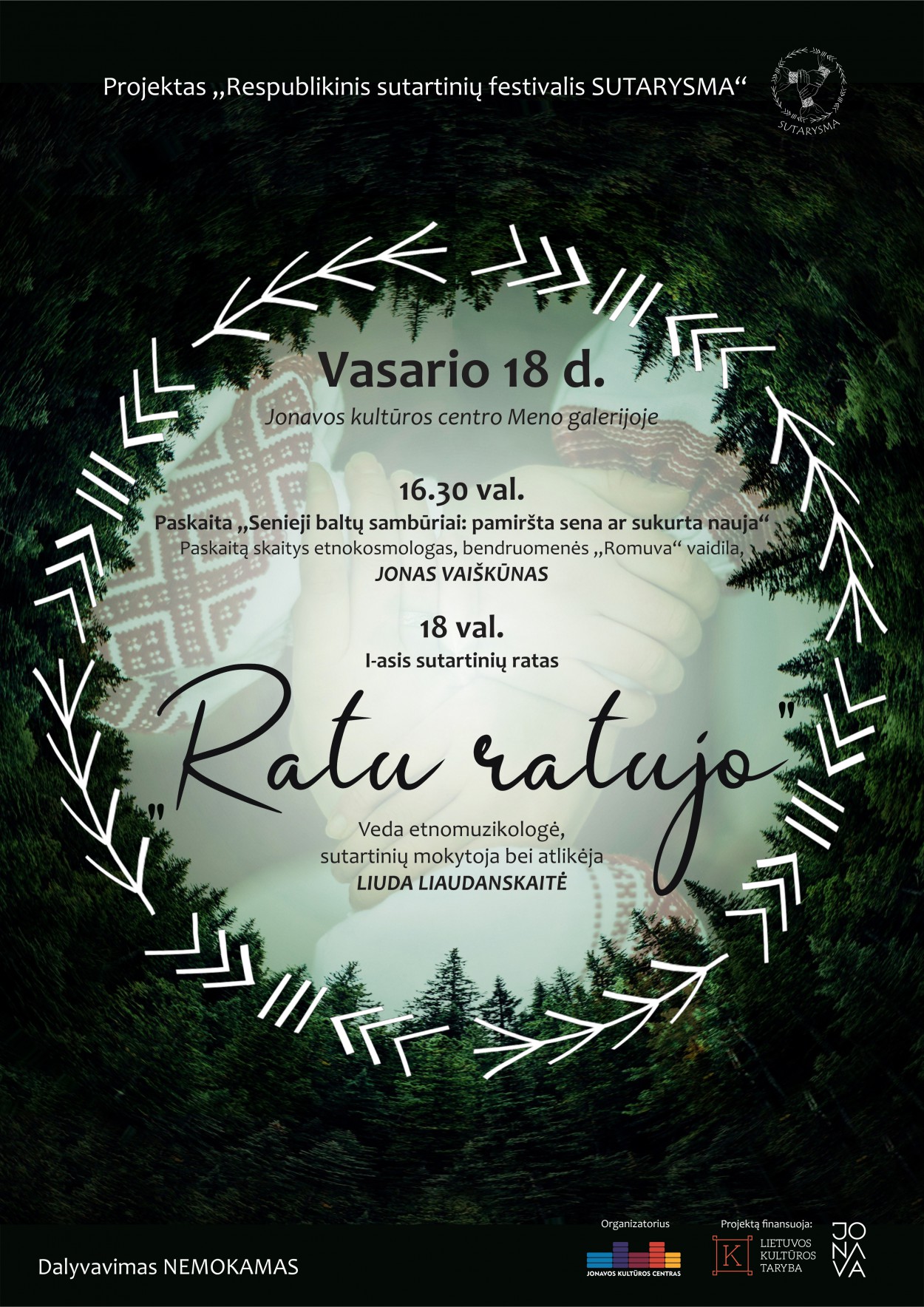 Įvertinus didžiulį sutartinių poreikį ir naudą, šiais metais nuspręsta žmonėms sudaryti kuo daugiau galimybių susirinkti draugėn ir mokytis senovinių giesmių. Taip gimė idėja organizuoti jaukius penktadieninius sutartinių ratus „Ratu ratujo“. Užsiėmimai vyks kas antrą penktadienį, iš viso jų bus 10. Šios unikalios tradicijos jonaviečius mokys etnomuzikologė, sutartinių mokytoja bei atlikėja Liuda Liaudanskaitė. Sutartinių ratus papildys ir iš dviejų dalių sudarytas paskaitų ciklas „Senieji baltų sambūriai: pamiršta sena ar sukurta nauja“, kurio metu dar giliau leisimės į baltiškąją kultūrą ir atrasime jos atspindžius šiuose laikuose. Pirmąją paskaitą ves ir visą projektą užkurs profesionalus ir charizmatiškas pranešėjas – etnokosmologas, Etninės kultūros globos tarybos narys, bendruomenės „Romuva“ vaidila Jonas Vaiškūnas.