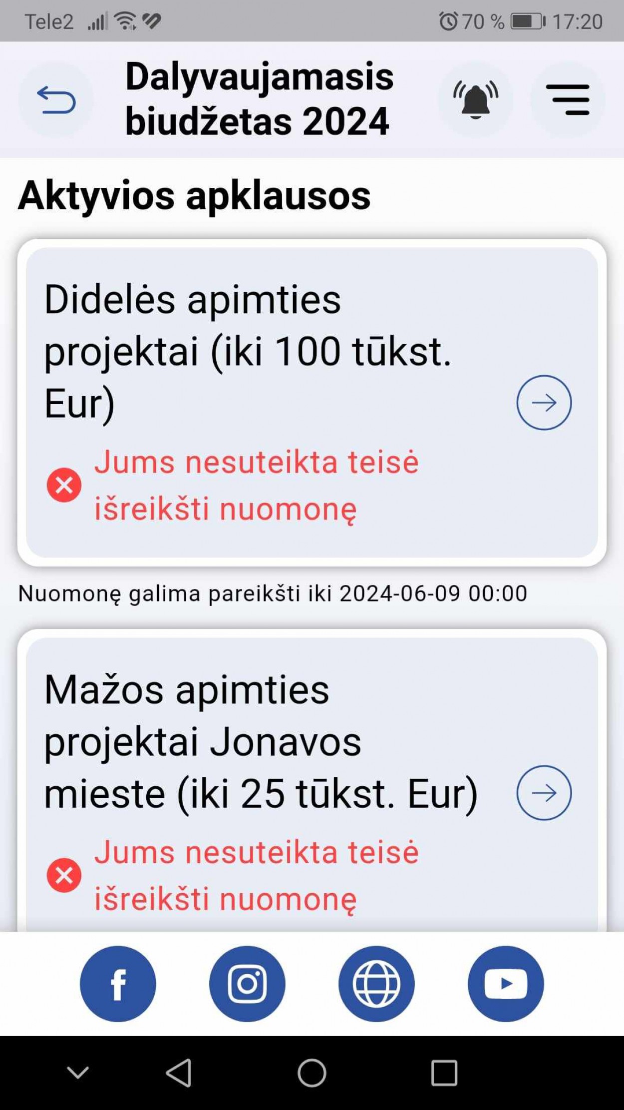 ,,Kai kurie jonaviečiai negali balsuoti už Dalyvaujamojo biudžeto projektus mob. programėlėje JONAVA. Šis techninis gedimas jau šalinamas. Jei ir Jūs matote pranešimą, kad „Jums nesuteikta teisė išreikšti nuomonę", kviečiame savo balsą už projektus atiduoti interneto svetainėje skyrelyje Gyventojams >> Apklausos. Atsiprašome už nepatogumus", - rašoma programėlės pranešimų skiltyje.