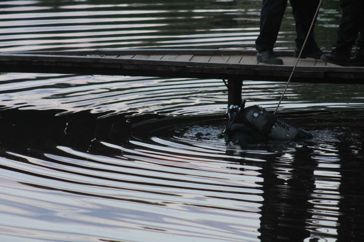 Šveicarijos gyvenvietėje, tvenkinyje, Kauno apskrities priešgaisrinės gelbėjimo valdybos narai ieško galimai nuskendusio žmogaus.