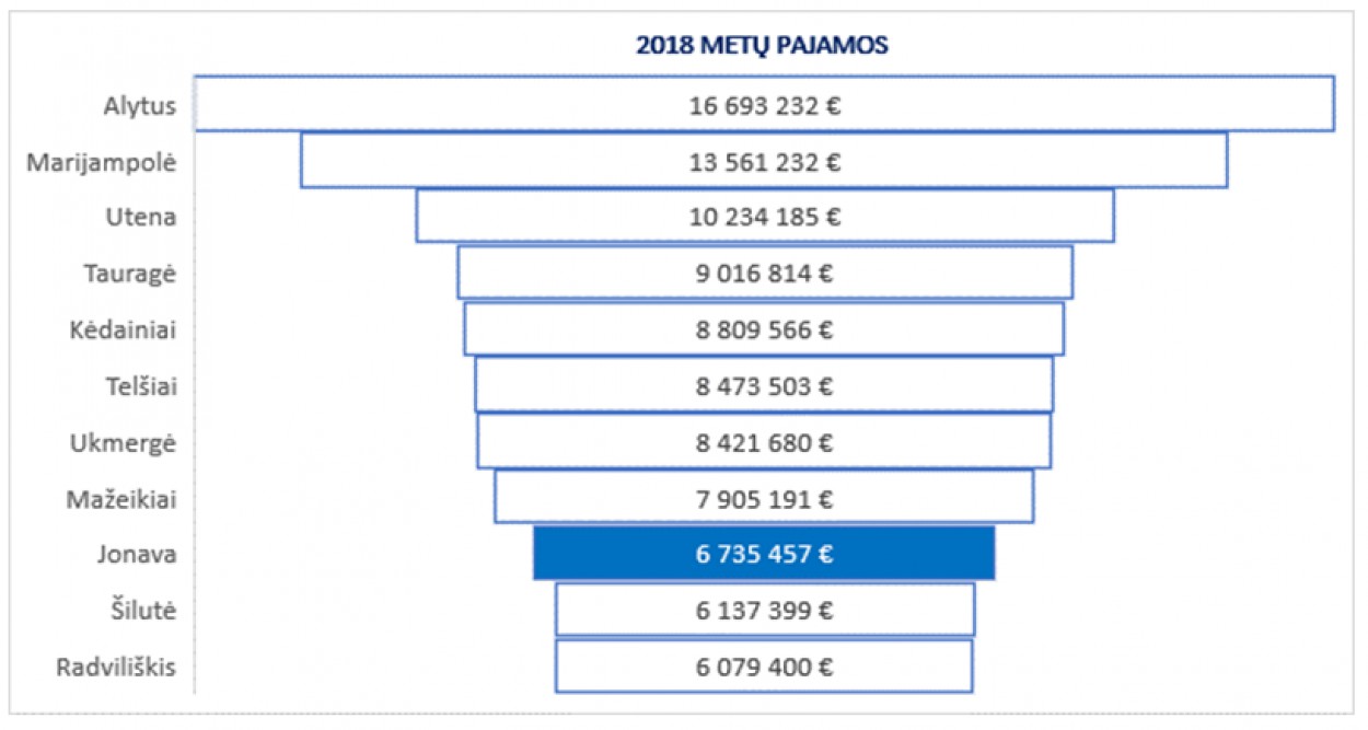 Pirmoje lentelėje atskleidžiamas Jonavos ligoninės pajamų apimties santykis su kitomis regioninėmis ligoninėmis. Žinant, kad pagal gyventojų skaičių Jonavos rajono savivaldybė būtų šio sąrašo pirmoje pusėje, duomenys leidžia daryti išvadą, kad Jonavos ligoninė galimai neišnaudoja visų galimybių gauti pajamas (žiūrėti trečią lentelę).