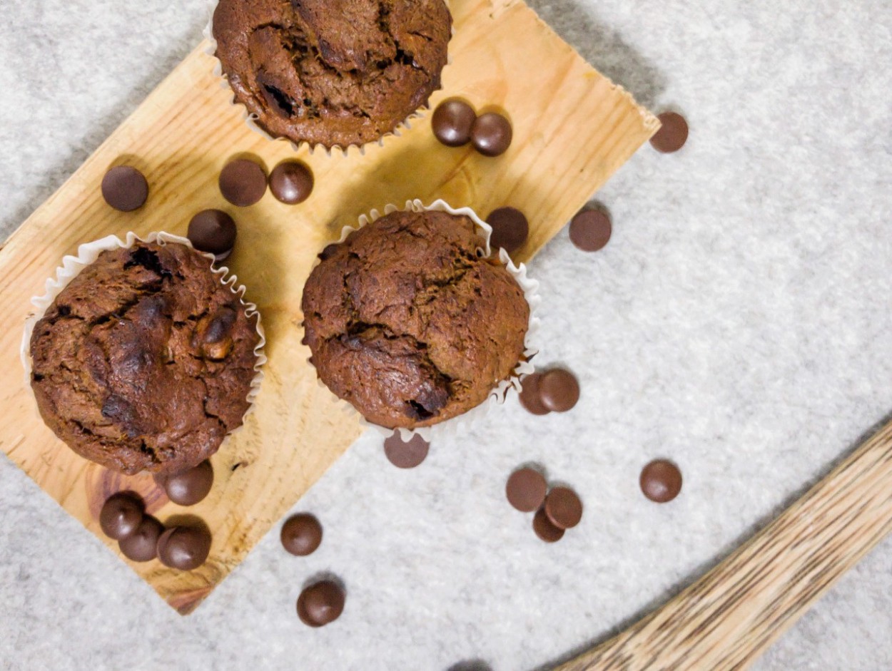 Įkaitinkite orkaitę iki 170 laipsnių temperatūros. Dideliame dubenyje sumaišykite miltus, kakavos miltelius, cukrų, kepimo miltelius ir druską. Viską gerai išmaišykite. Į atskirą dubenį supilkite pieną, kiaušinius, vanilę ir aliejų. Masę suplakite šakute. Skystų ingredientų masę supilkite į jau paruoštą tešlą. Gerai išmaišykite, kad neliktų miltų likučių. Viską tolygiai supilkite į keksiukų formeles ir ant viršaus užberkite šokolado drožlių. Įdėkite į orkaitę ir kepkite apie 23-25 minutes. Smaližiaukite iš karto.