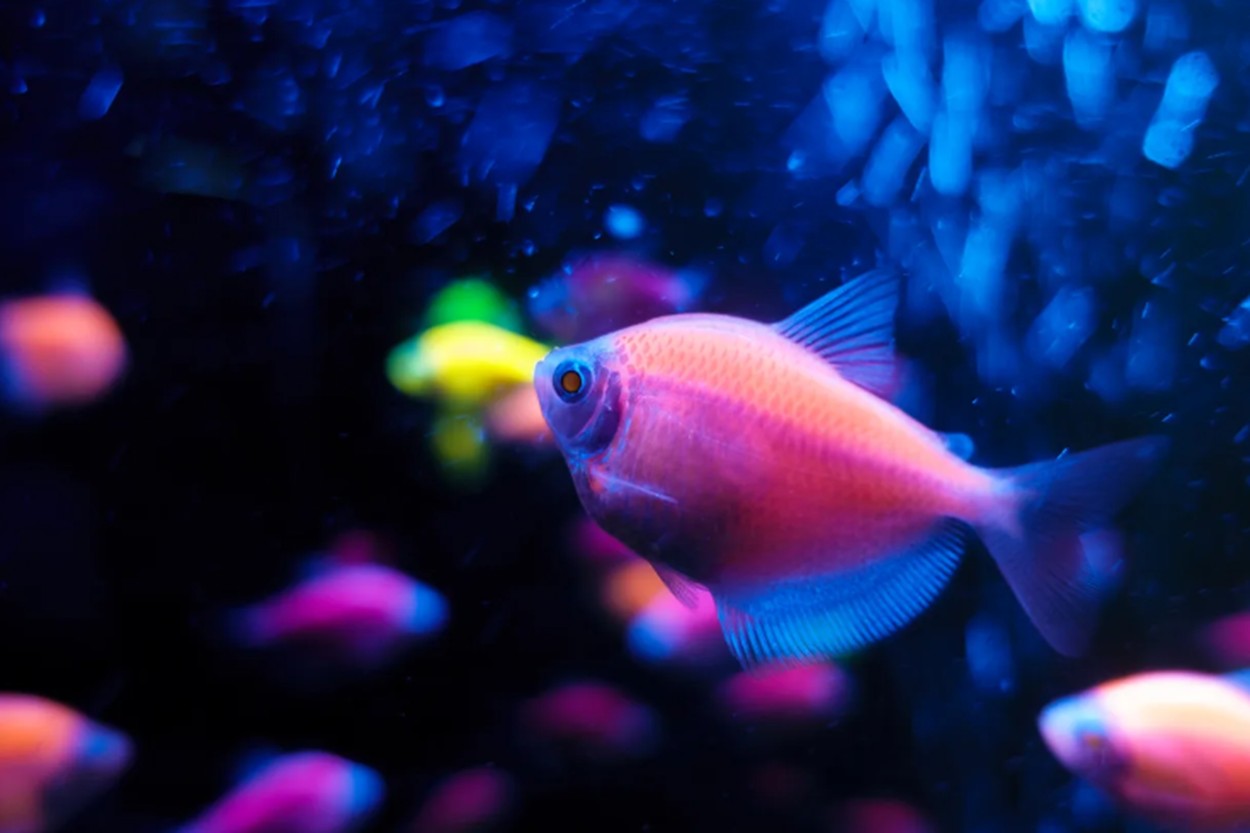 Pradinis šios technologijos tikslas nebuvo akvariumai. 1999 m. Singapūro nacionalinio universiteto mokslininkai įterpė medūzos (lot. Aequorea victoria) žalia spalva švytinčio geno baltymą į žuvytės (lot. Danio rerio) DNR, siekdami sukurti gyvus biojutiklius vandens užterštumui stebėti. Vėliau atsirado komercinės transgeninių žuvyčių rūšys, įskaitant raudonas ir oranžines žuvis, sukurtas įterpiant koralų Discosoma fluorescencinius genus.