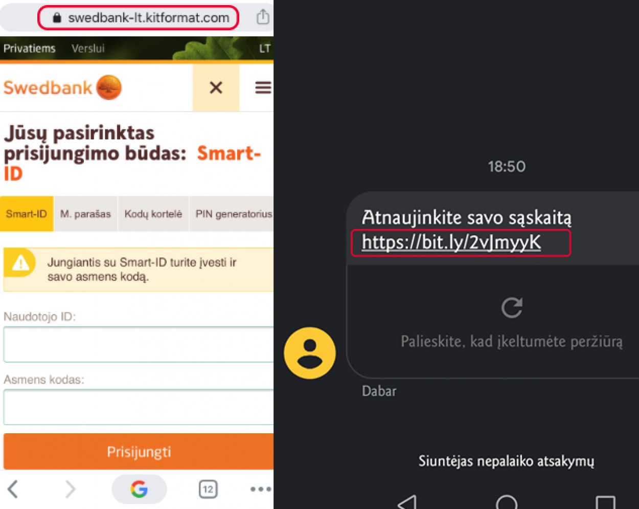 „Mus pasiekė žinia, kad kai kurie banko klientai gavo SMS žinutes su prašymu atnaujinti informaciją. SMS esanti nuoroda nukreipia į netikrą „Swedbank“ puslapį. Jeigu gavote tokią ar panašią žinutę, jokiu būdu nesuvedinėkite prisijungimo duomenų“, - skelbia bankas.