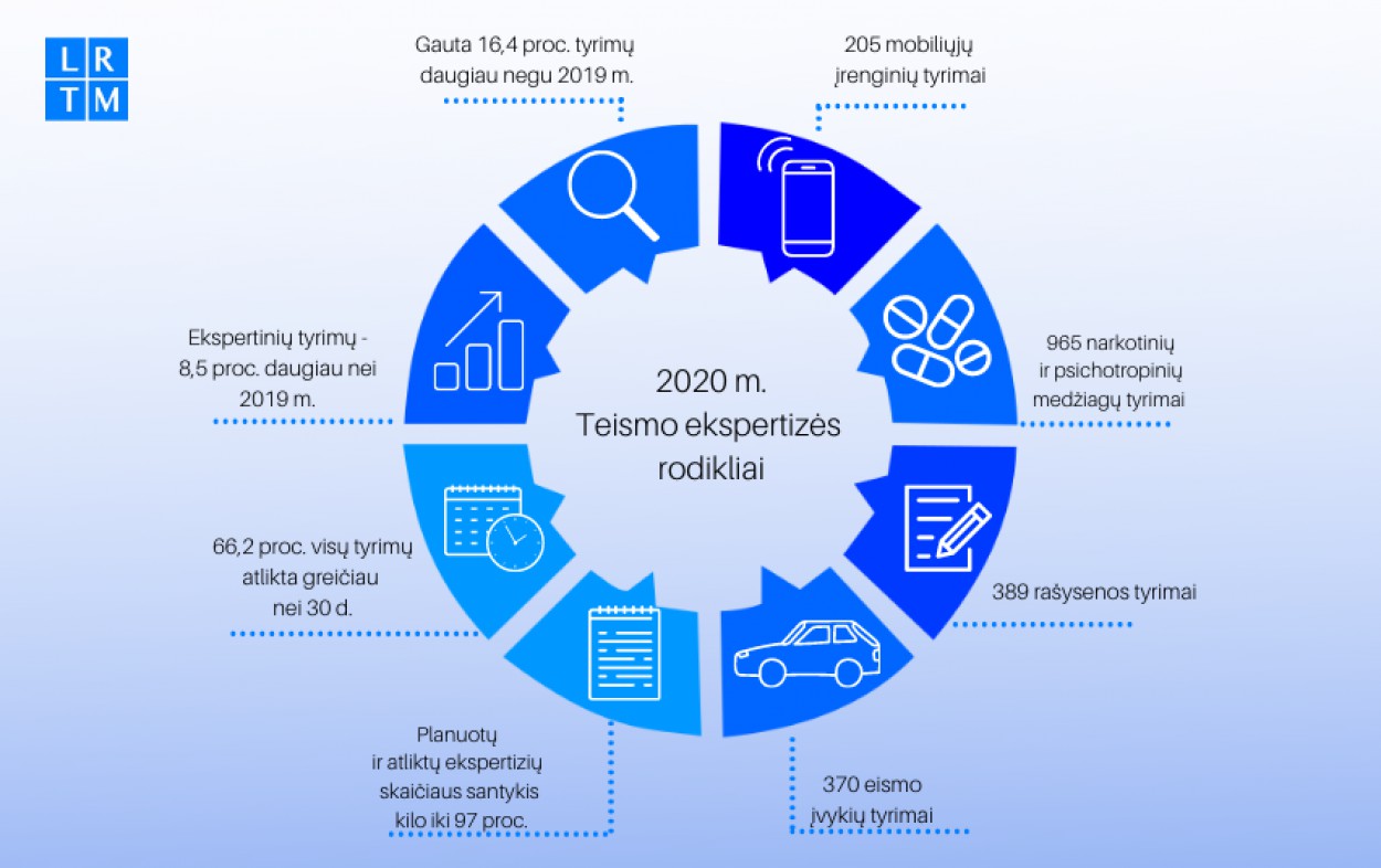 Pandemijos akivaizdoje efektyvūs sprendimai lėmė Lietuvos teismo ekspertizių centro veiklos optimizavimą. Pažangos padėjo pasiekti ir naujausių technologijų diegimas, leidęs sutrumpinti atliekamų tyrimų eiles, o didėjanti tyrimų tendencija rodo augantį užsakovų pasitikėjimą. Per praėjusius metus daugiausia atlikta narkotinių ir psichotropinių medžiagų (965), rašysenos (389), eismo įvykių (370) bei mobiliųjų įrenginių (205) tyrimų.
