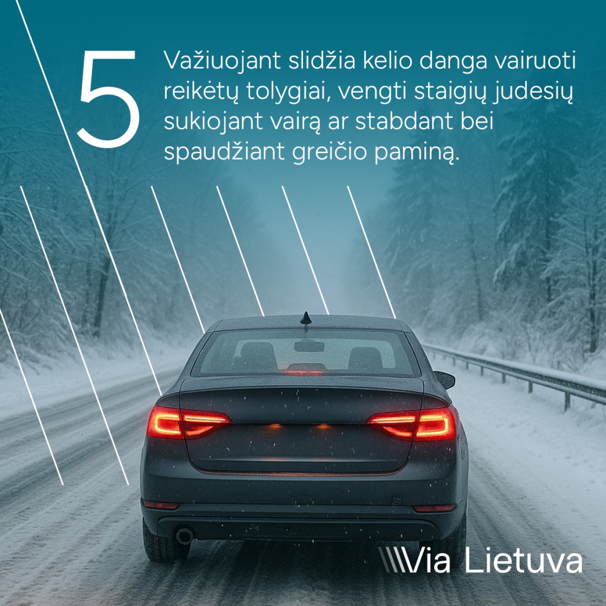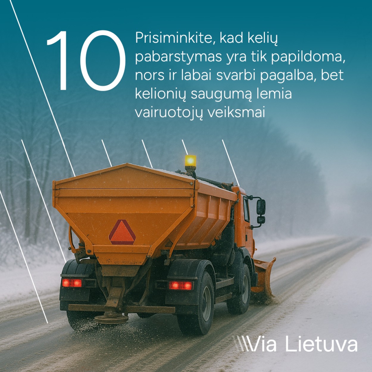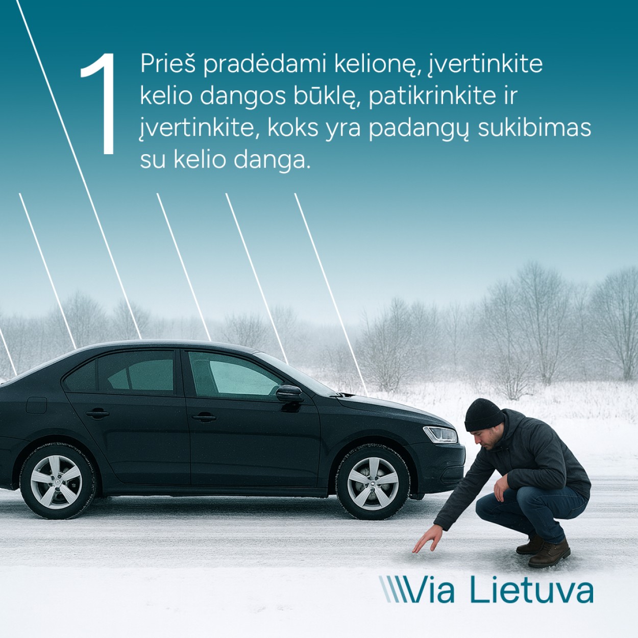 Žiemą pasikeičia vairavimo sąlygos, todėl, prieš pradedant kelionę šiuo metų laiku, būtina nustatyti kelio dangos būklę, patikrinti ir patiems įsivertinti, koks yra padangų sukibimas su kelio danga, t. y. važiuojant paspausti stabdžius, žinoma, įsitikinus, kad tai daryti saugu. Vairuotojai turėtų atsiminti, kad kelių pabarstymas yra tik papildoma, nors ir labai svarbi, pagalba. Vis dėlto kelionių saugumą lemia vairuotojų veiksmai.