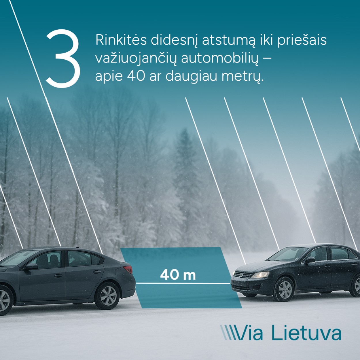 Važiuojant žiemą, reiktų rinktis didesnį atstumą iki priešais važiuojančių automobilių, kad, esant pavojingai situacijai ir slidžiai kelio dangai, užtektų laiko sustabdyti automobilį. Stabdymas turėtų būti ne staigus, o lėtesnis ir tolygus. Žiemą saugus atstumas yra tas, kuris nuvažiuojamas per 3 sekundes nuo priekyje esančios transporto priemonės. Kelių eismo taisyklėse yra nustatyta, kad saugus atstumas yra distancija lygi pusei važiavimo greičio. Tai reiškia, kad, jei vairuotojas važiuoja 50 km/val. greičiu, saugus atstumas turėtų būti 25 metrai, t. y. 2 sekundės, tačiau, kaip minėta, žiemą reikia palikti didesnį atstumą, t. y. apie 40 metrų.