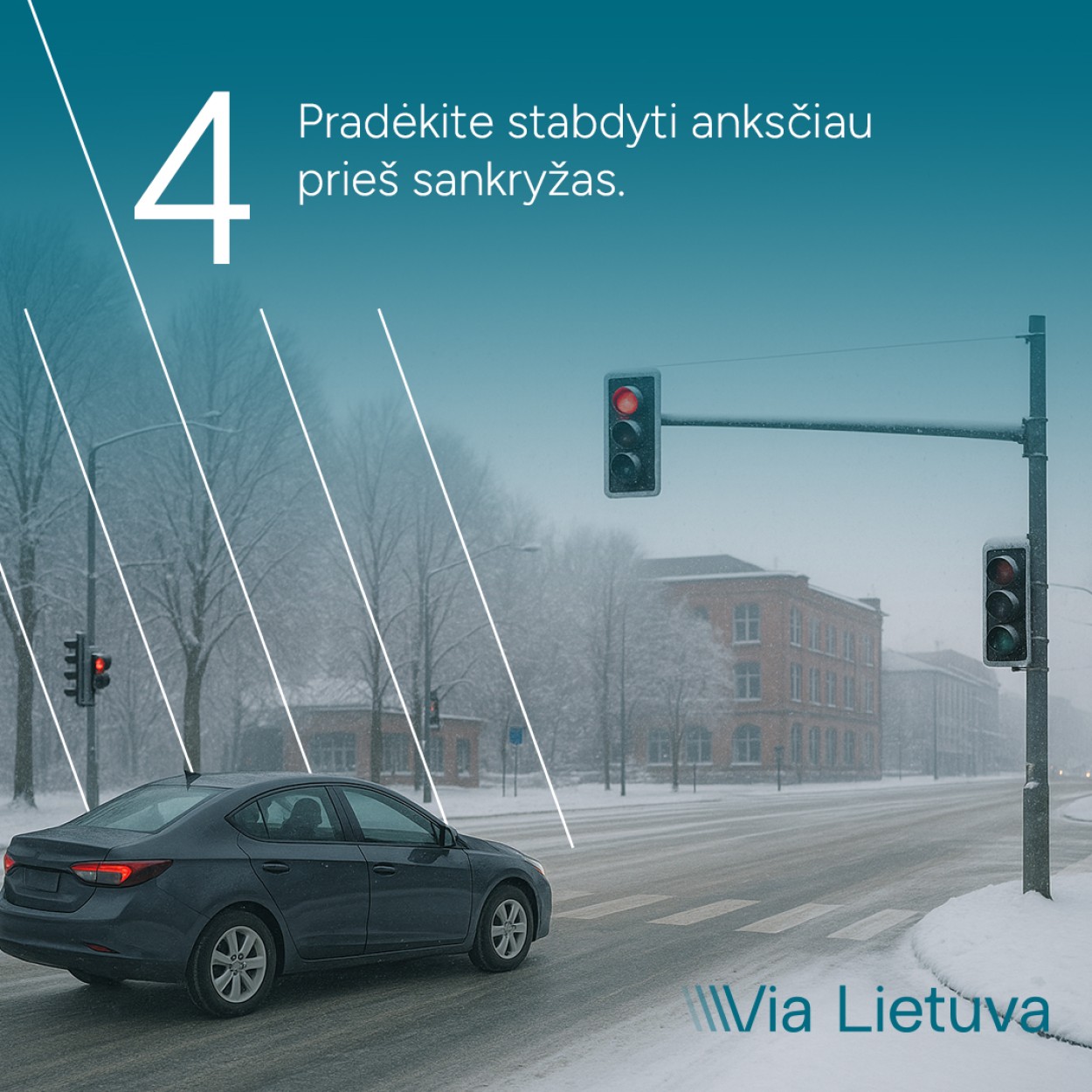 Taip pat reikia prisiminti, kad ir sankryžos yra slidžiausi kelio ruožai, nes dėl nuolatinio stabdymo sankryžose susidaro ledas, todėl artėjant prie sankryžų žiemą reiktų pradėti stabdyti bent prieš 50 metrų ar netgi anksčiau.
