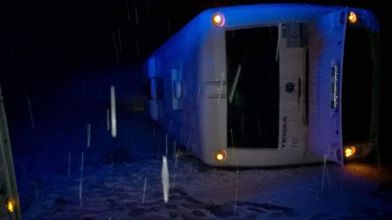 Šįvakar apie 18.40 val. maršrutu Vilnius-Kaunas važiavo autobusas, kuris Kaišiadorių r., kelyje Jonava-Mijaugonys 8 km, esant slidžiai kelio dangai, nuvažiavo nuo kelio ir dešiniajame kelkraštyje apvirto ant šono.