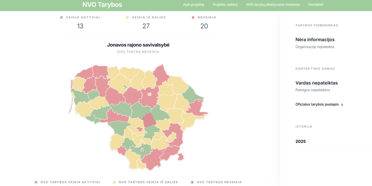 Platformoje www.nvotarybos.lt skelbiami NVO tarybų efektyvumo indekso duomenys rodo, kad net trečdalyje šalies savivaldybių jos neveikia, 27 veikia tik iš dalies, ir tik 13-oje savivaldybių šios tarybos pasižymi aktyvia veikla.
