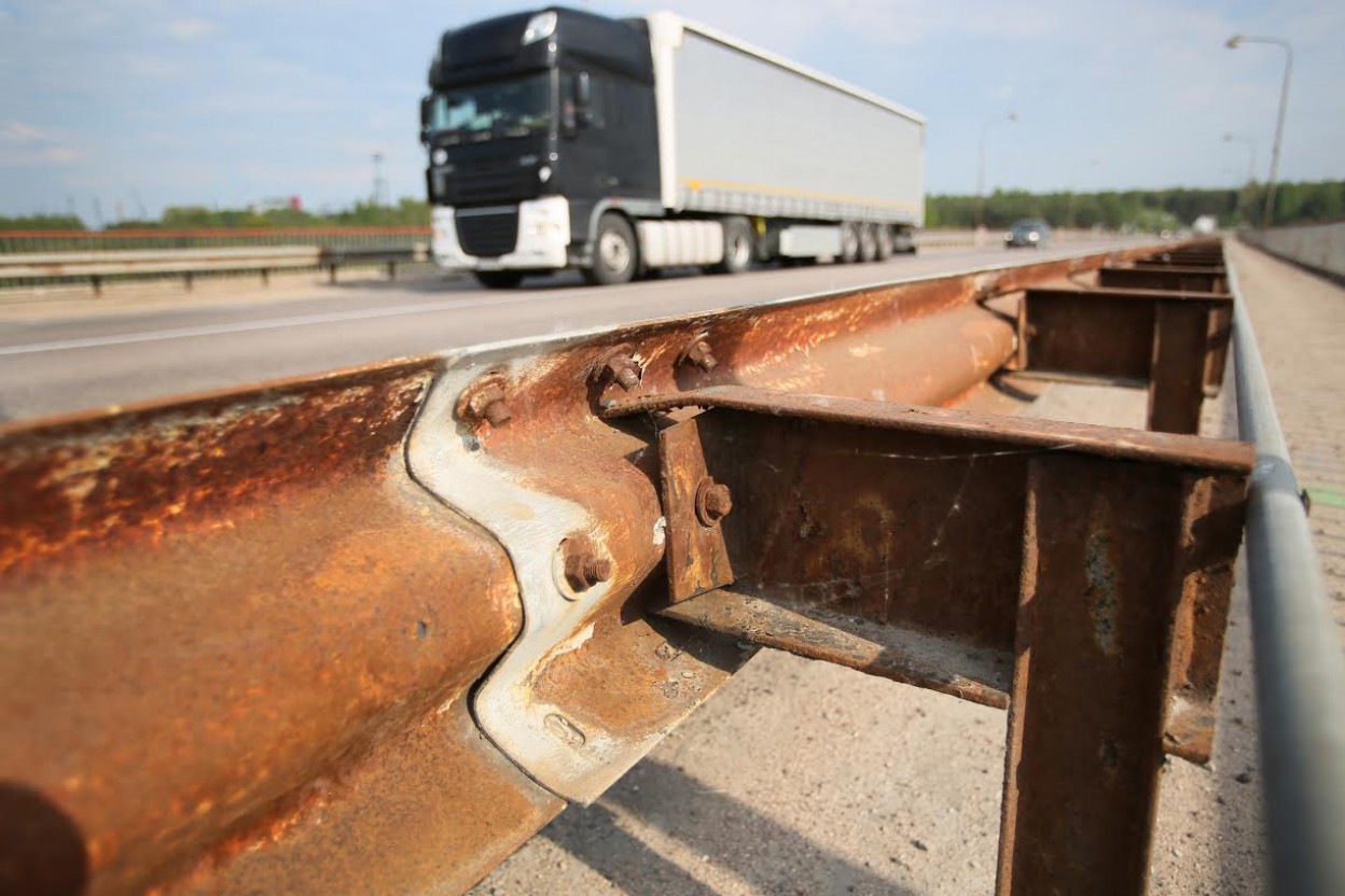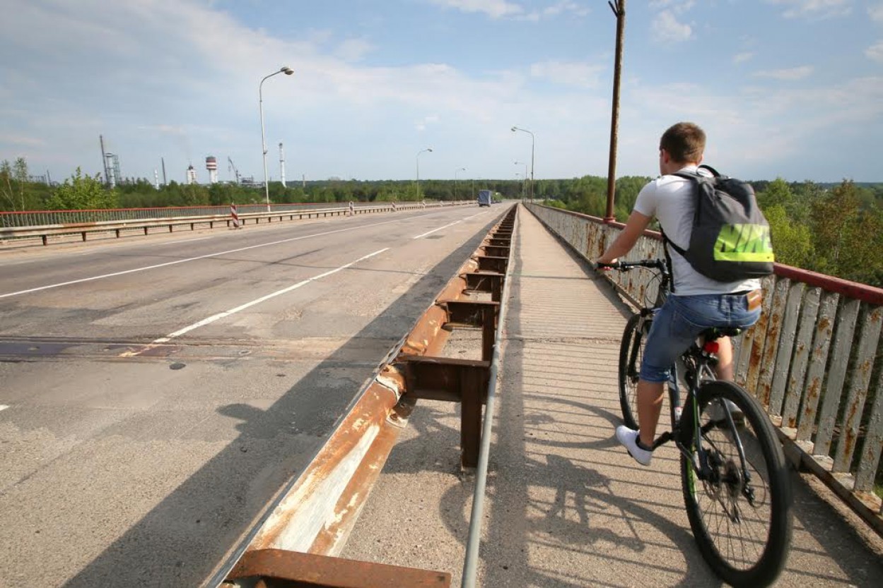 Pėstiesiems skirtos tilto dalies dangos būklė bloga, danga nelygi, turėklai - nesaugūs. Pažeistas krantinių atramų apsauginis betono sluoksnis, koroduoja metalinės dalys. Turėklinių blokų būklė prasta, aptrupėjęs apsauginis betono sluoksnis, metalinės dalys pažeistos korozijos. Pasenusi lietaus vandens nutekėjimo sistema, techninių laiptų būklė prasta, trūksta kelių sekcijų.