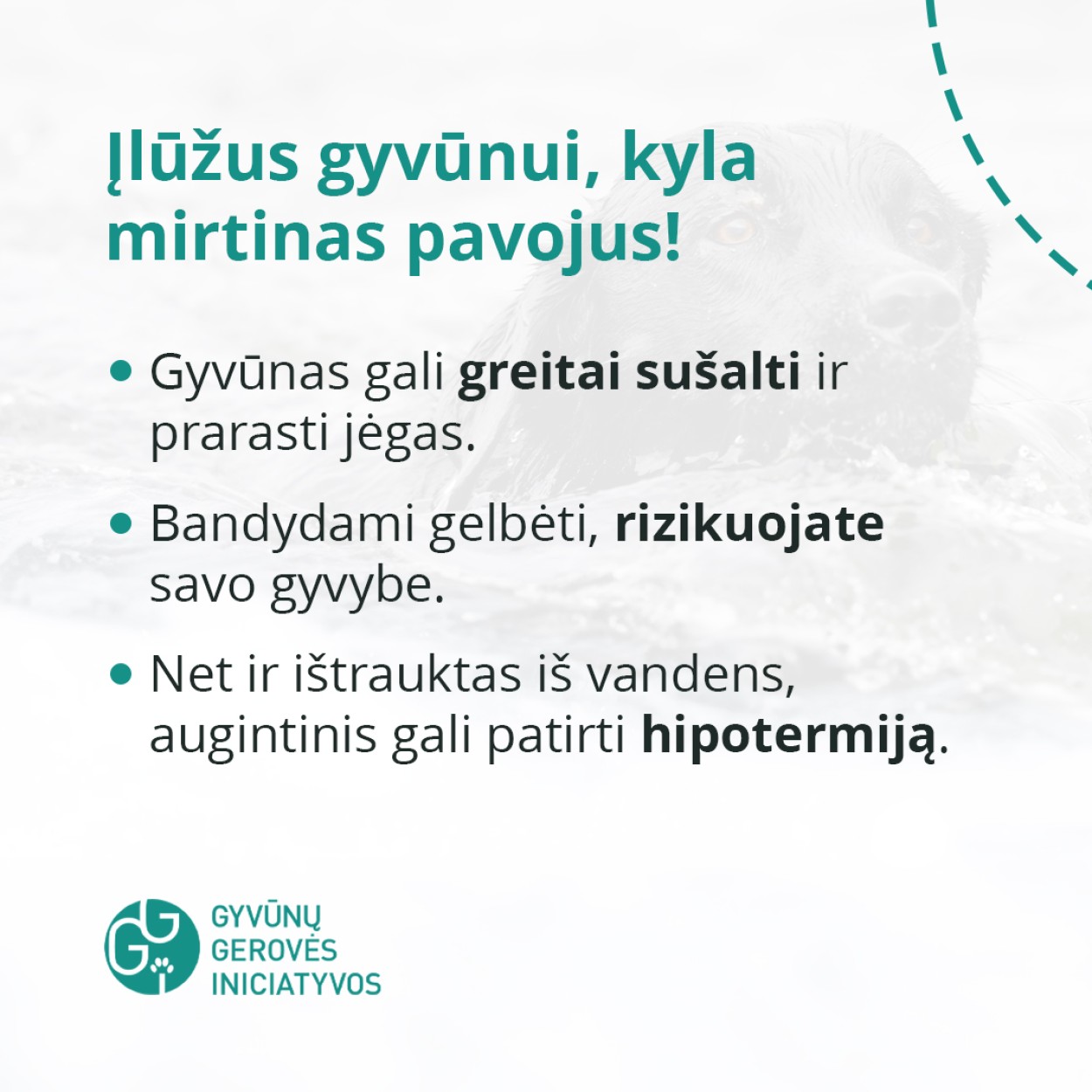 „Atėjęs pavasaris vis labiau džiugina saulės spinduliais, tirpsta ledas, kuris buvo padengęs vandens telkinius storu sluoksniu per didžiausius žiemos šalčius. Žiemą žmonės kartu su vaikais ir augintiniais drąsiai vaikšto ant tokio ledo, čiuožinėja pačiūžomis, rogutėmis. Esant pliusinei temperatūrai reikėtų elgtis atsakingai ir ant tirpstančio ledo nelipti nei patiems, nei leisti lakstyti augintiniams, net jei atrodo, kad jis vis dar pakankamai storas ir mažai atitirpęs“ – teigia nevyriausybinės organizacijos „Gyvūnų gerovės iniciatyvos“ vadovė Beatričė Vaitiekūnaitė.
