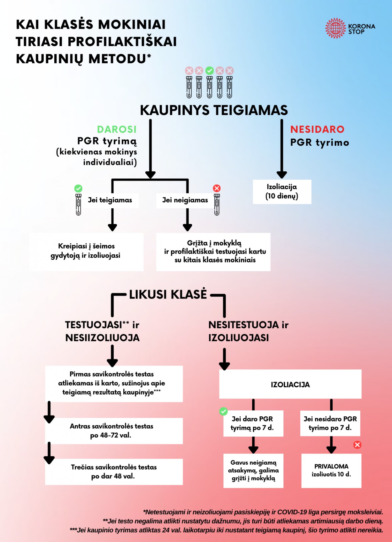 Kaip ir iki šiol, nebus izoliuojami vakcinuoti ir persirgę mokiniai. Kiti ugdytiniai turi pasirinkimą – izoliuotis arba testuotis. Neizoliuojami mokiniai, kurie testuojasi savikontrolės greitaisiais antigeno testais tris kartus: iškart po atvejo nustatymo, antrą kartą – praėjus 48–72 valandoms ir pakartotinai trečią kartą – dar po 48 valandų. Svarbu pažymėti, kad jei neįmanoma išlaikyti nustatyto testavimo dažnumo, galima testuotis artimiausią darbo dieną. Jeigu mokinys yra testuotas 24 val. iki patvirtinto COVID-19 ligos atvejo ar teigiamo kaupinio nustatymo, šis testas užskaitomas, kaip pirmas testas algoritme. Testavimo algoritmas galioja ne ilgiau, nei 10 dienų nuo paskutinės sąlyčio dienos.