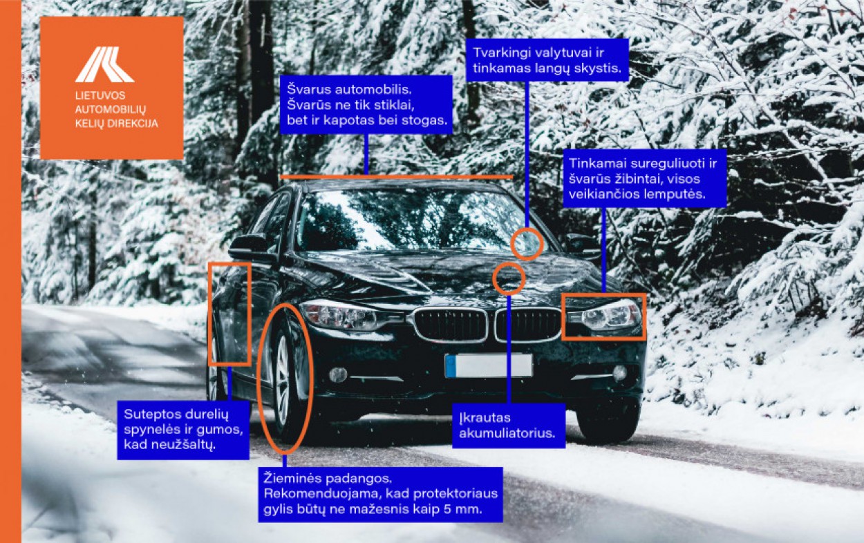Permainingos oro sąlygos, gausiau iškretantis sniegas, spaudžiantis šaltukas sunkina eismo sąlygas, ragina vairuotojus būti dar atidesnius kelyje, rinktis saugų greitį, laikytis saugaus atstumo nuo kitų transporto priemonių. Tačiau ne tik vairuotojo veiksmai dalyvaujant eisme yra svarbu – kitas svarbus aspektas yra tvarkinga automobilio techninė būklė ir priežiūra. Valstybės įmonė Lietuvos automobilių kelių direkcija (toliau – Kelių direkcija) primena, kad žiemą būtina eksploatuoti tik tinkamai šiam metų laikui paruoštą automobilį.