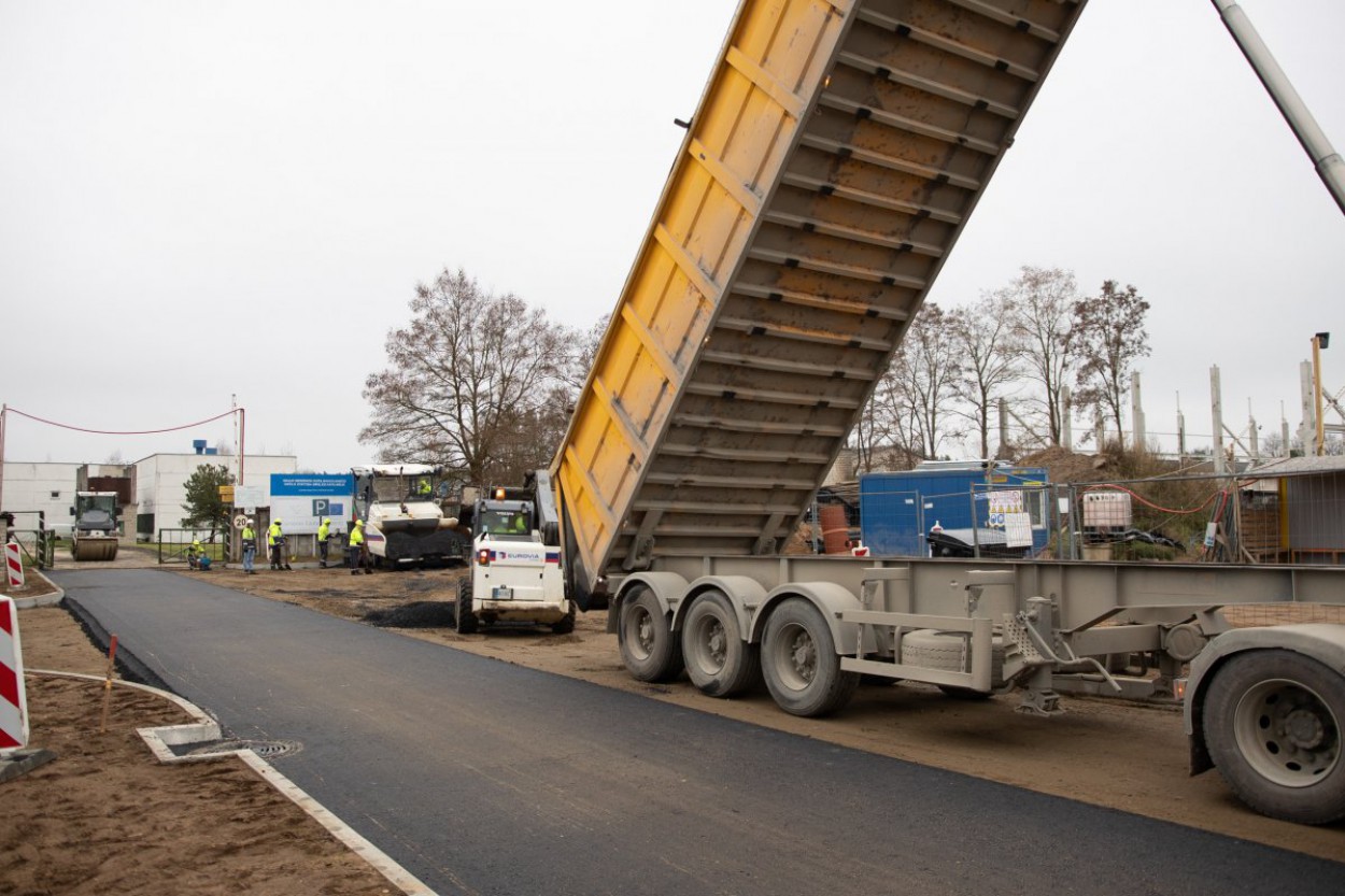 Jonavoje prie statomos naujos aliuminio profilių gamyklos pradedamas asfaltuoti privažiavimo kelias, bus įrengtos įvažos į sklypą Ukmergės g. 17.