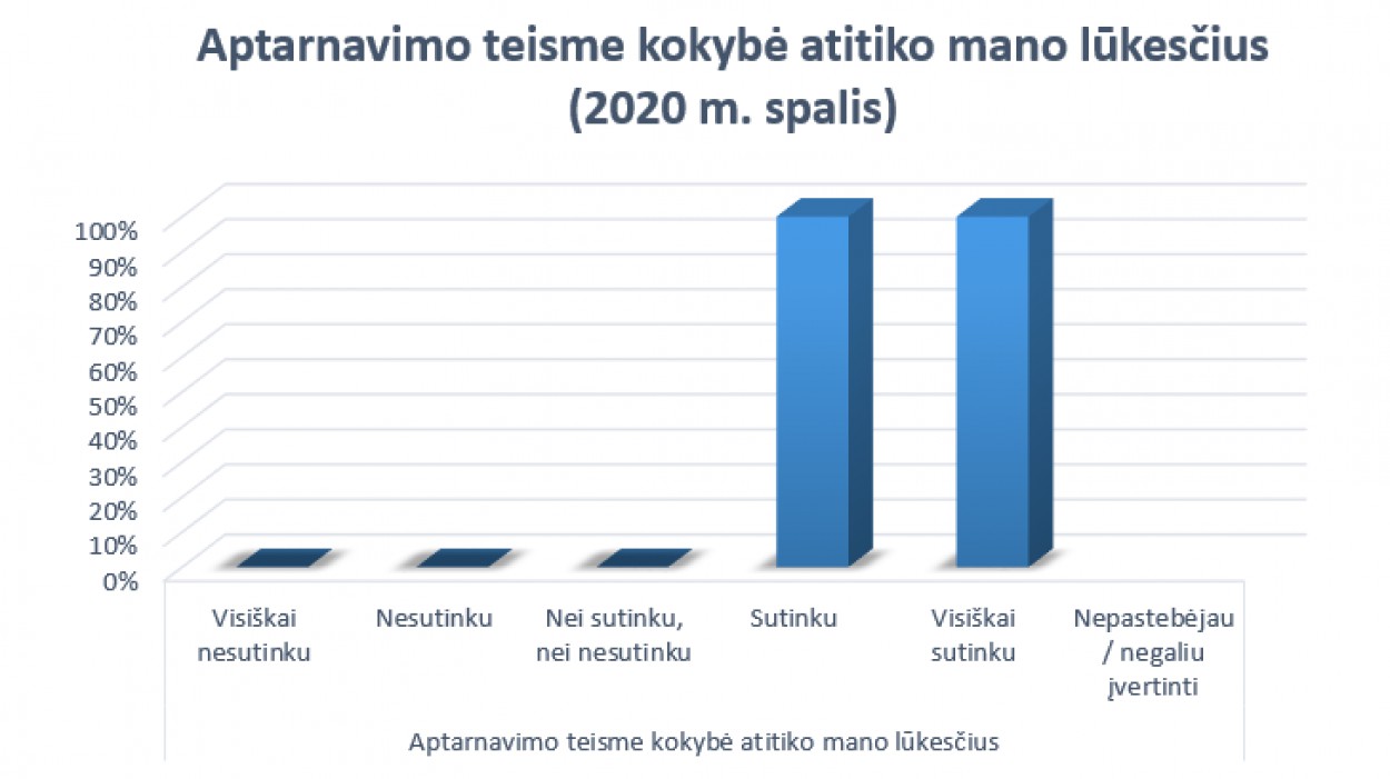 Gauti rezultatai patvirtina, jog 2020 metais asmenys gerai vertino teismo darbuotojų mandagų bendravimą, kokybišką aptarnavimą, kvalifikuotą klausimų sprendimą ir bendras klientų aptarnavimo lygis teisme atitiko asmenų lūkesčius, o asmenų aptarnavimo kokybė nuolat gerėjo.