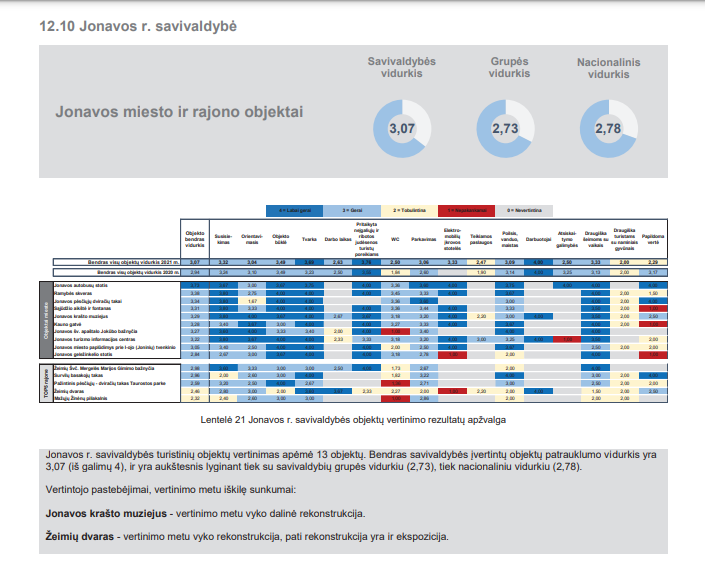 "Jonavos r. savivaldybės turistinių objektų vertinimas apėmė 13 objektų. Bendras savivaldybės įvertintų objektų patrauklumo vidurkis yra 3,07 (iš galimų 4), ir yra aukštesnis lyginant tiek su savivaldybių grupės vidurkiu (2,73), tiek nacionaliniu vidurkiu (2,78)," - rašoma Lietuvos turistinių vietovių patrauklumo vertinimo tyrimo ataskaitoje, Jonavos r. savivaldybės objektų vertinimo rezultatų apžvalgoje.