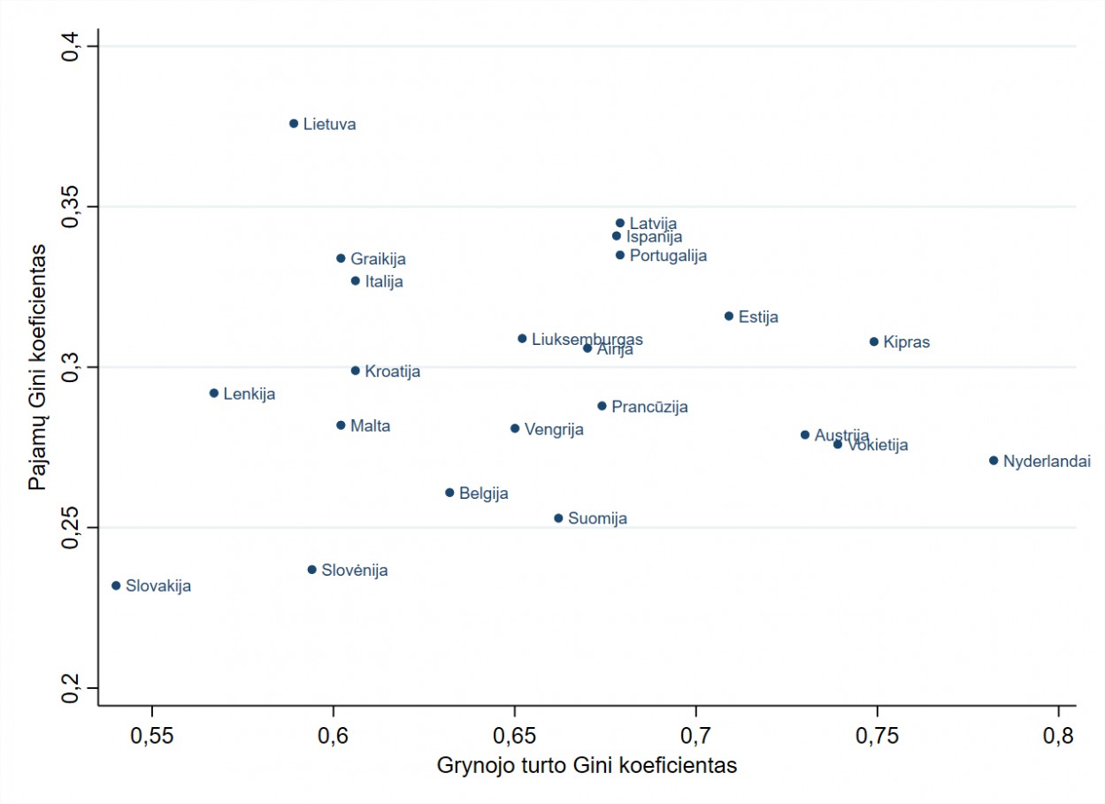 Gana netikėti turto nelygybės tyrimo rezultatai sudaro akivaizdų kontrastą pajamų nelygybės rodikliams, pagal kuriuos Lietuva vis dar yra tarp Europos šalių, kuriose nelygybė didžiausia. Pagal didelę pajamų ir gana mažą turto nelygybę Lietuva atsiduria greta Graikijos ir Italijos. Priešingoje pusėje yra tokios šalys kaip Vokietija, Kipras, Austrija ar Nyderlandai – jose turto nelygybė didelė, bet pajamų nelygybė maža. Kitose Baltijos šalyse, Latvijoje ir Estijoje, pajamų pasiskirstymas tarp namų ūkių šiek tiek tolygesnis nei Lietuvoje, tačiau jose kur kas didesnė turto nelygybė. Didžiausias balansas Slovakijoje, Lenkijoje ir Slovėnijoje – jose fiksuojama gana maža tiek turto, tiek pajamų nelygybė.