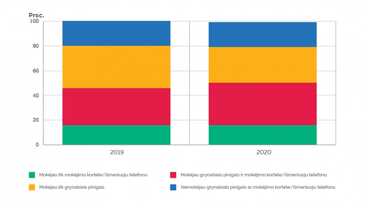 Nors 2020 m. 7 proc. (2019 m. – 6 %) apklaustųjų teigė negaunantys ir nenaudojantys grynųjų pinigų, grynaisiais pinigais buvo mokama šiek tiek rečiau, tačiau šiam atsiskaitymo būdui vis dar teko labai svarbi vieta. Dieną prieš apklausą tik grynaisiais pinigais mokėjo 29 proc. apklaustųjų (2019 m. – 34 %), 34 proc. visų respondentų mokėjo grynaisiais ir mokėjimo kortele ar išmaniuoju telefonu (2019 m. – 30 %), o 16 proc. – tik mokėjimo kortele ar išmaniuoju telefonu.