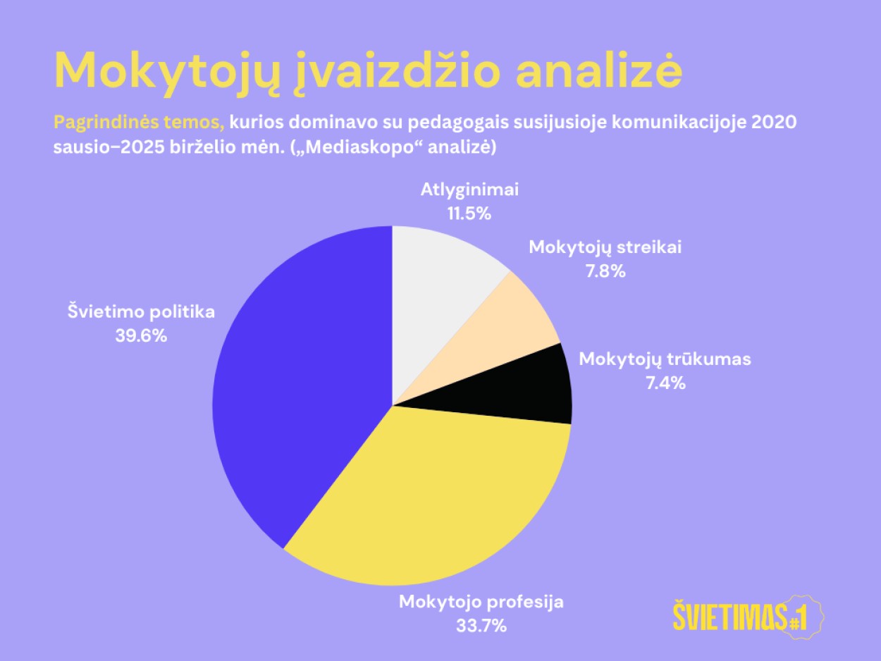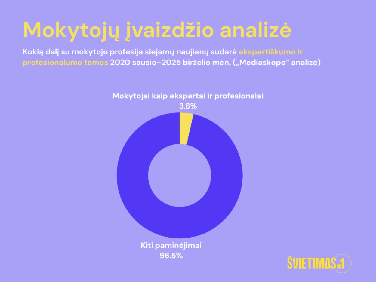 „Tai įdomu, nes švietimo temos sudaro tik apie 5 proc. viso viešojo diskurso, rodo mūsų užsakymu žiniasklaidos tyrimų bendrovės „Mediaskopas“ šiemet atlikta analizė. Be to, mokytojai tik mažoje dalyje – 4 proc. – naujienų, susijusių su pedagogais, pristatomi kaip savo srities ekspertai. O net 40 proc. naujienų, kuriose minimi mokytojai, yra susijusios su politinėmis temomis“, – pažymi L. Masiliauskaitė.