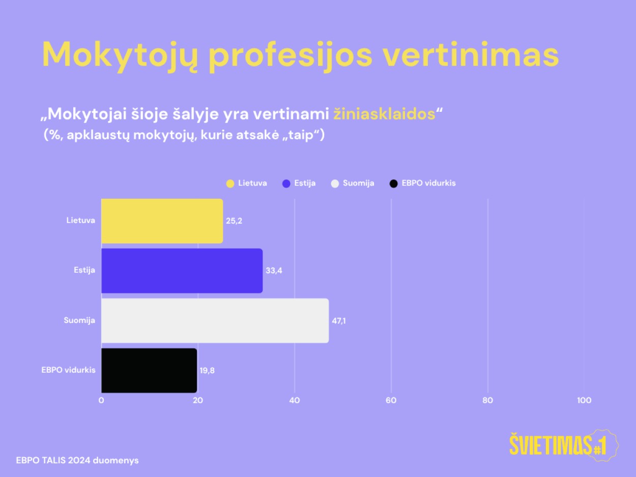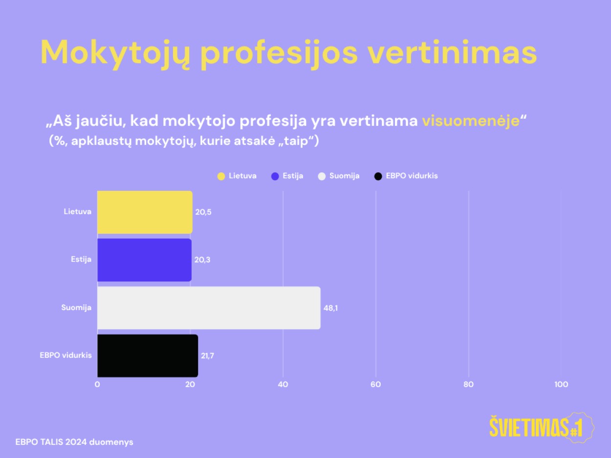 Taip pat, TALIS duomenimis, vos penktadalis apklaustų Lietuvos mokytojų mano, kad jų profesija vertinama bendrai visuomenėje. Lietuvos rodiklis artimas EBPO vidurkiui (22 proc.) ir yra toks pat kaip Estijoje. Suomijoje, kur mokytojams suteikiama didelė autonomija, profesijos vertinimą jaučia net 48 proc. pedagogų. Kitoje skalės pusėje – Prancūzija, kur visuomenės vertinamais jaučiasi vos 4 proc. mokytojų.