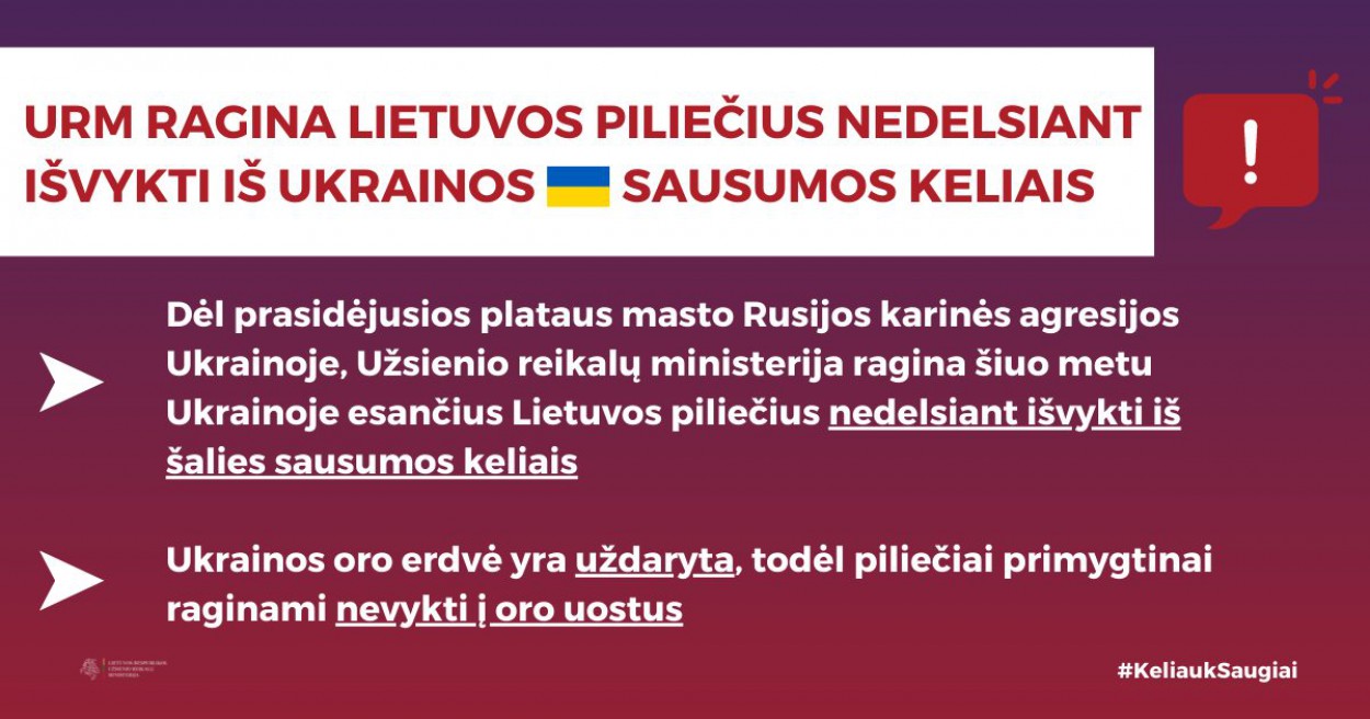 Dėl prasidėjusios plataus masto Rusijos karinės agresijos Ukrainoje, Užsienio reikalų ministerija (URM) ragina šiuo metu Ukrainoje esančius Lietuvos piliečius nedelsiant išvykti iš šalies sausumos keliais.