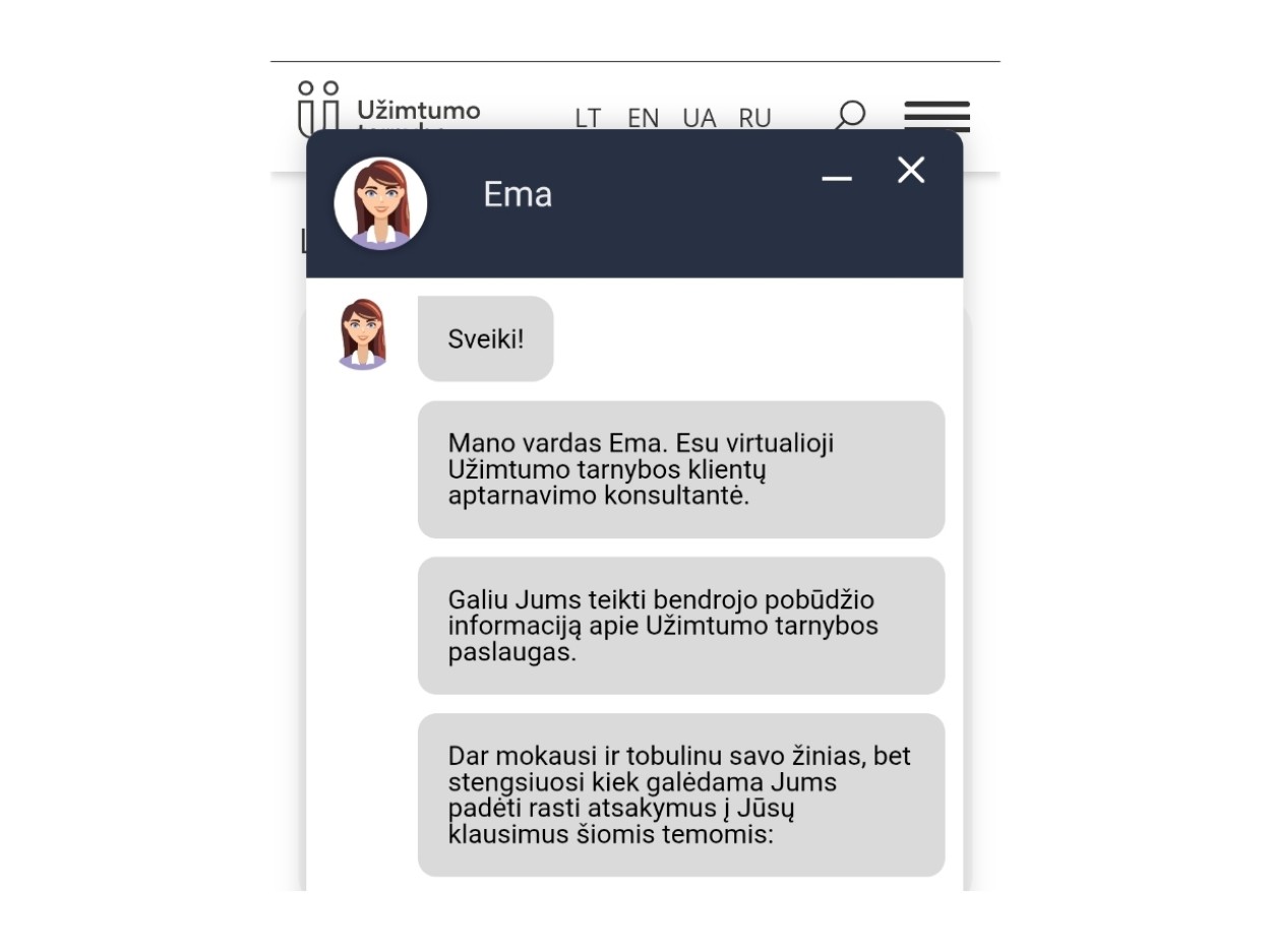 Beveik dvejus metus šalies gyventojus įvairiais darbo rinkos klausimais internete konsultuoja virtualioji asistentė Ema. Padedant dirbtiniam intelektui vien šiemet suteikta 55,5 tūkst. konsultacijų ir atsakyta į 216,7 tūkst. žinučių.