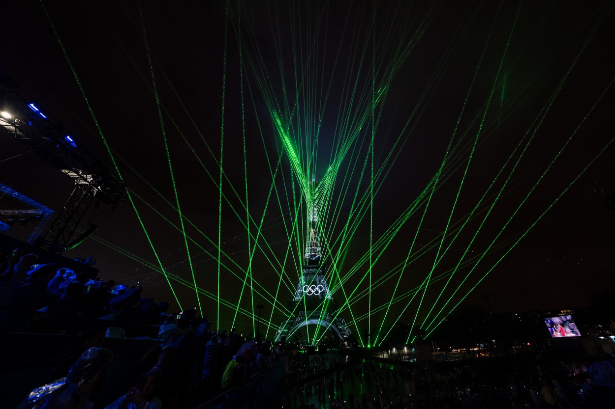 Įspūdingas šviesų ir lazerių reginys puošė pagrindinį miesto simboilį - Eifelio bokštą, ant kurio įsikūrė ir simboliniai Olimpinių žaidynių žiedai.