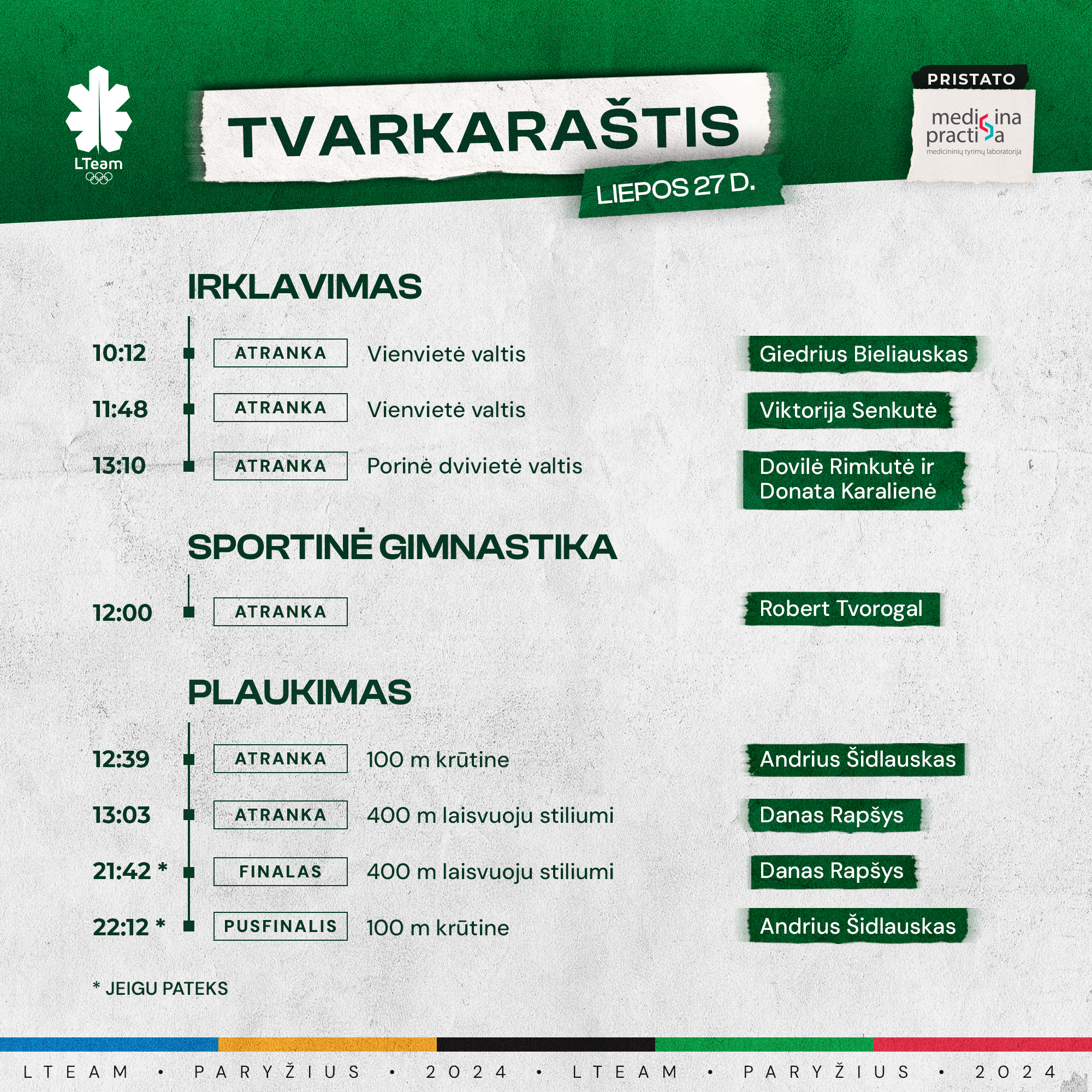 Po iškilmingo atidarymo vakaro, jau šiandien prasideda sportininkų kovos dėl geriausiųjų vardo. Lietuvos atstovai šiandien susigrums irklavimo, sportinės gimnastikos ir plaukimo rungtyse.