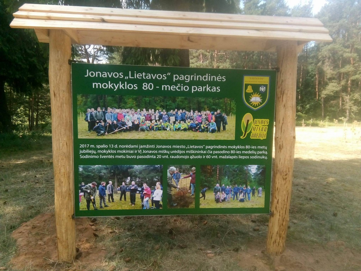 „2017 metais spalio 13 d. norėdami įamžinti Jonavos miesto .,Lietavos“ pagrindinės mokyklos 80- ies metų jubiliejų, mokyklos mokiniai ir VĮ Jonavos miškų urėdijos miškininkai Pageležių girininkijos kvartale (.... ) pasodino 80-ies medelių parką. Sodinimo šventės metu buvo pasodinta 20 vnt. raudonojo ąžuolo ir 60 vnt. mažalapės liepos sodinukų. 2018 metais birželio 13 d. VĮ Valstybinių miškų urėdijos Jonavos regioninio padalinio miškininkai parke pastatė atminimo stendą ( kurio vertė be statymo darbų 290,40 Eur su PVM.)