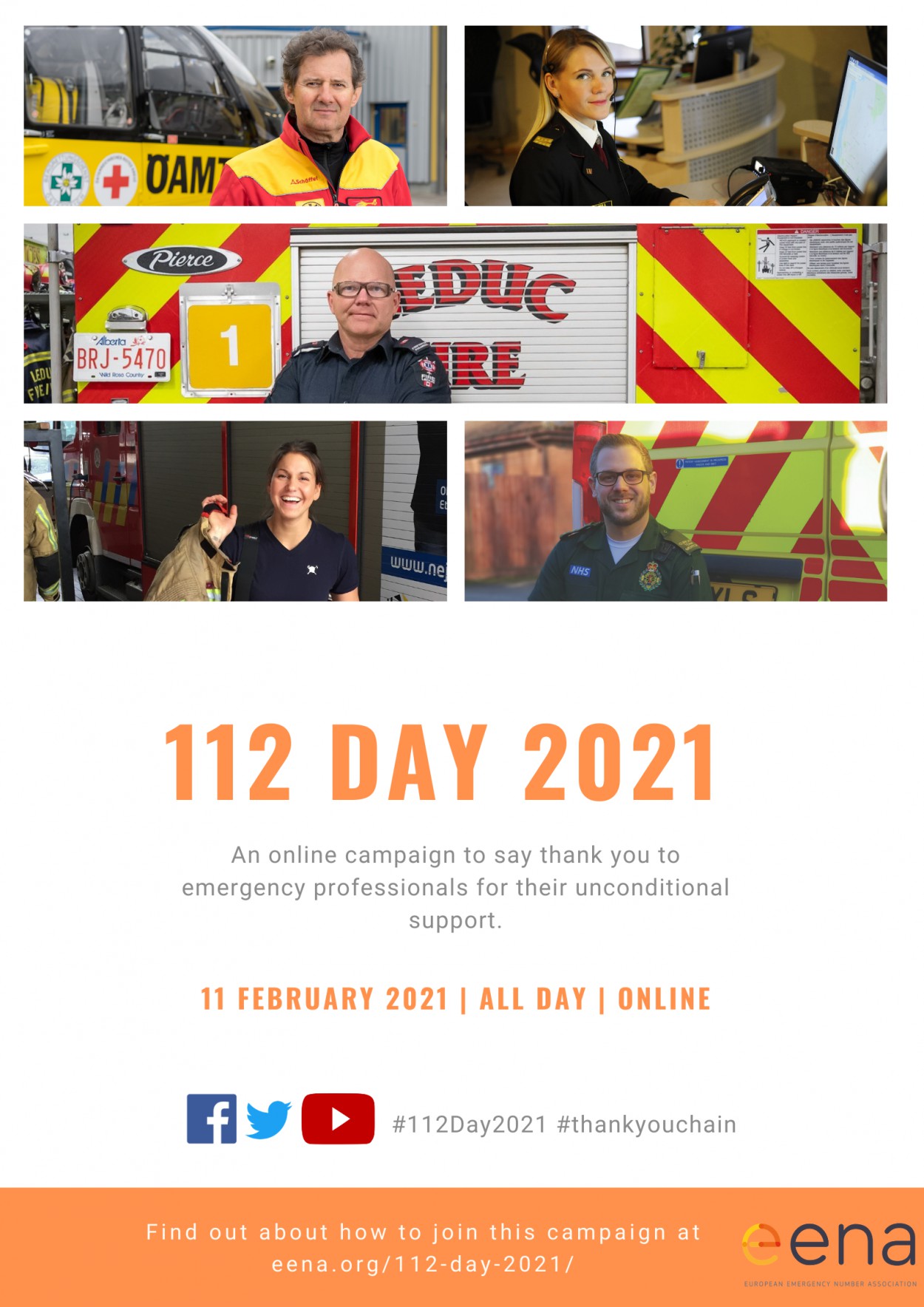 Todėl vasario 11-ąją dieną eiliniai piliečiai ir skubiosios pagalbos tarnybų darbuotojai kviečiami socialiniuose tinkluose dalintis trumpomis istorijomis apie suteiktą pagalbą, skubiosios pagalbos tarnybų darbą ar tiesiog padėkos žodžiais ir žymėti juos grotažymėmis #112Day2021 bei #thankyouchain.