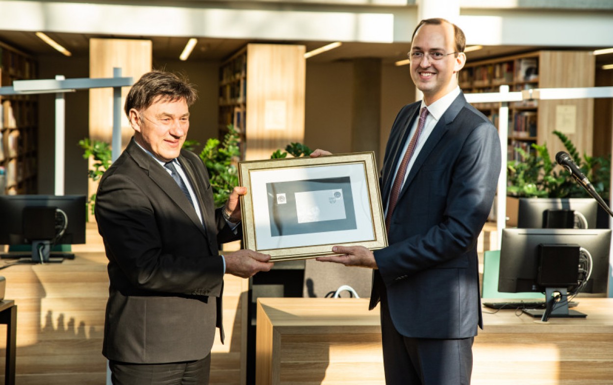 Minint Vytauto Didžiojo universiteto (VDU) šimtmetį, susisiekimo ministras Marius Skuodis antradienį pasveikino VDU ir universiteto rektoriui prof. Juozui Augučiui įteikė vieną iš pirmųjų atspausdintų, šiai progai skirtų pašto ženklo „Vytauto Didžiojo universitetui – 100 metų“ egzempliorių.