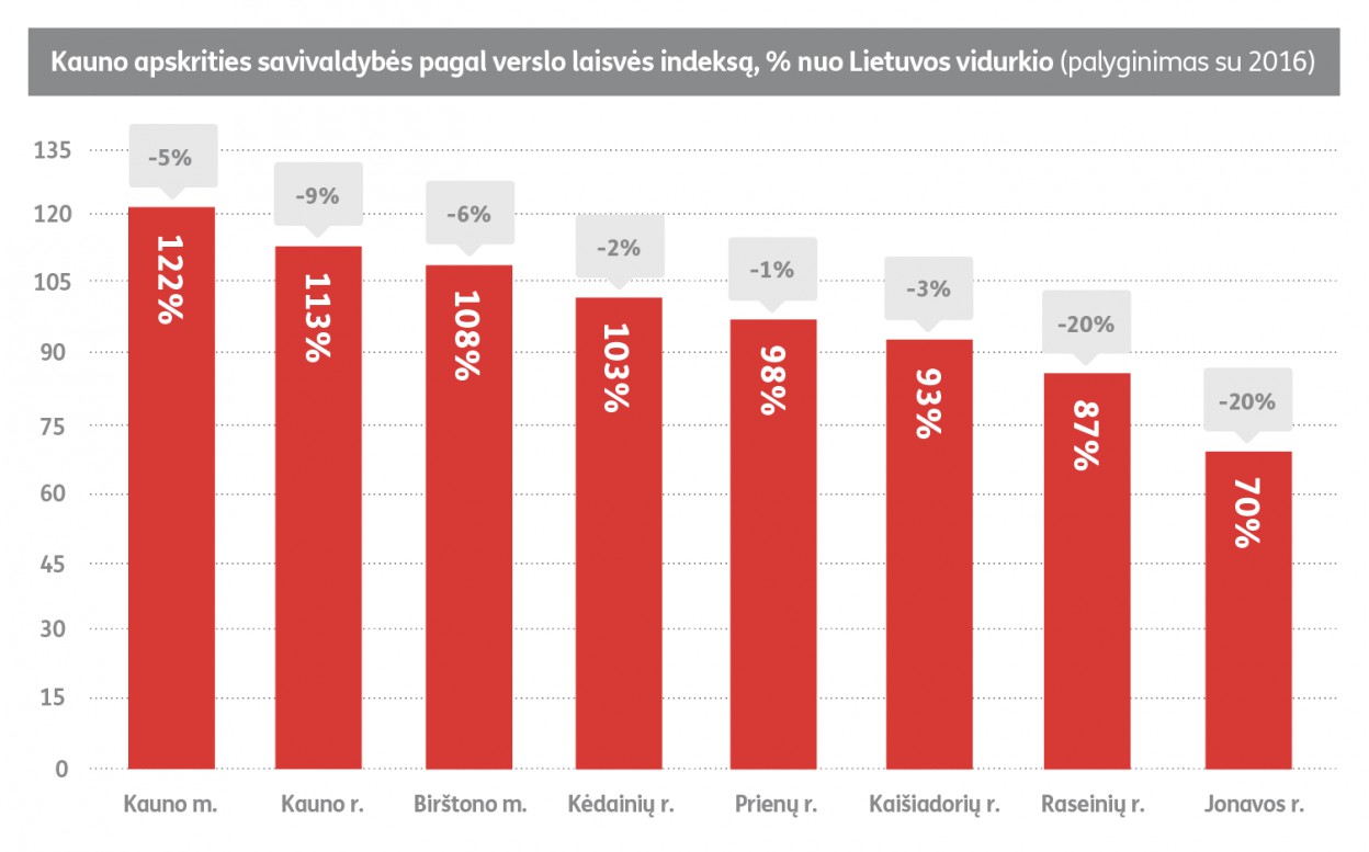 Pagal verslo laisvės indeksą Kauno miestas šiemet, kaip ir pernai, užėmė trečią vietą Lietuvoje, į priekį praleidęs Neringą ir Vilnių. Kitos Kauno apskrities savivaldybės – Kauno r., Birštono, Kėdainių r., Prienų r., Kaišiadorių r., Raseinių r. ir Jonavos r. – išsirikiavo atitinkamai 7-oje, 10-oje, 16-oje, 21-oje, 28-oje, 34-oje ir 48-oje vietose iš 60 savivaldybių.
