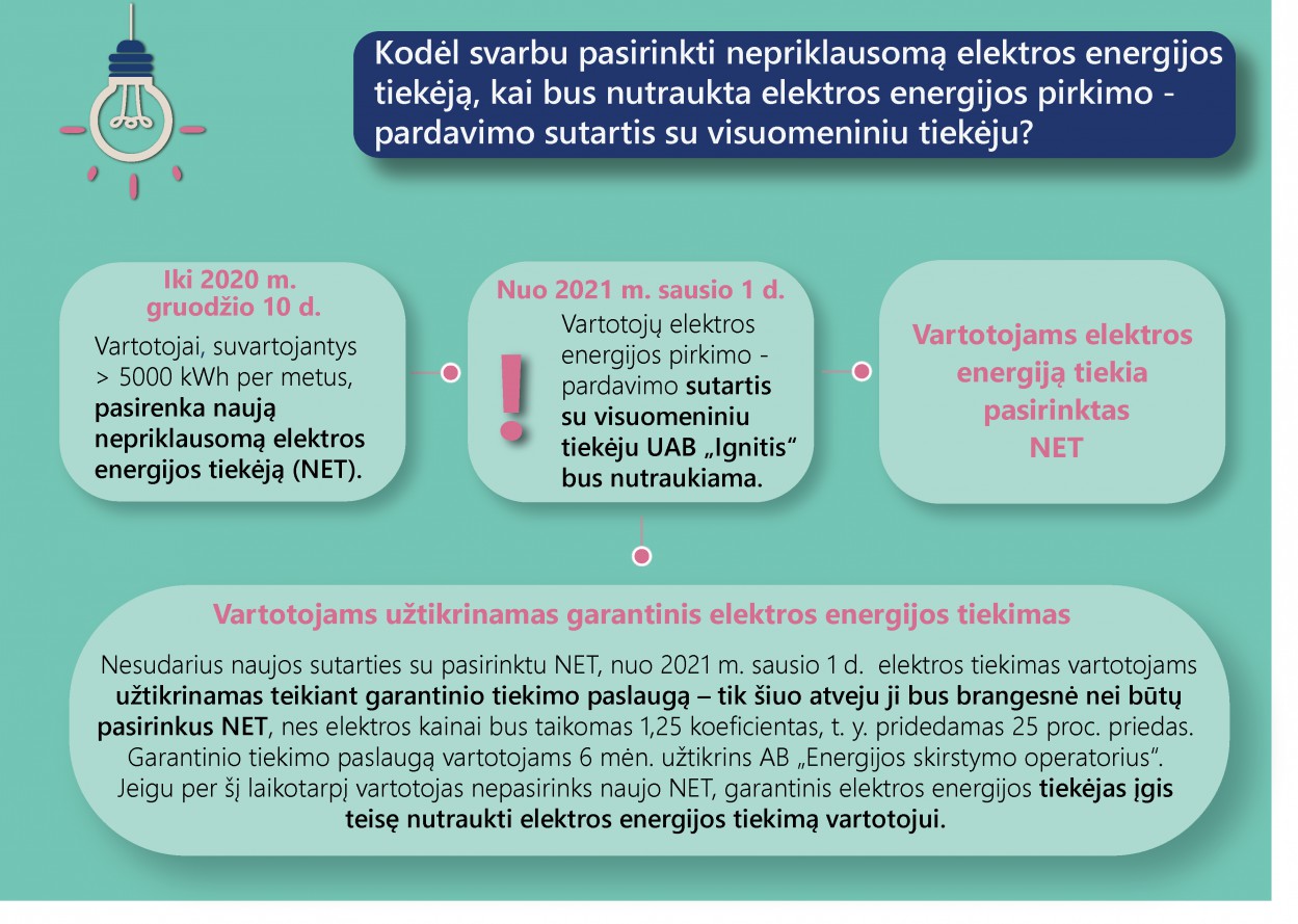 Dėl šios priežasties vartotojams, kurie iki 2020 m. gruodžio 10 d. nesudarys naujos sutarties su pasirinktu nepriklausomu elektros energijos tiekėju, nuo 2021 m. sausio 1 d. bus užtikrinta garantinio tiekimo paslauga, kuri, šiuo atveju, bus brangesnė nei pasirinkus nepriklausomą elektros energijos tiekėją, nes elektros energijos produkto kainai bus taikomas 1,25 koeficientas, t. y. pridedama 25 proc. prie biržoje įsigyjamos elektros energijos produkto kainos.