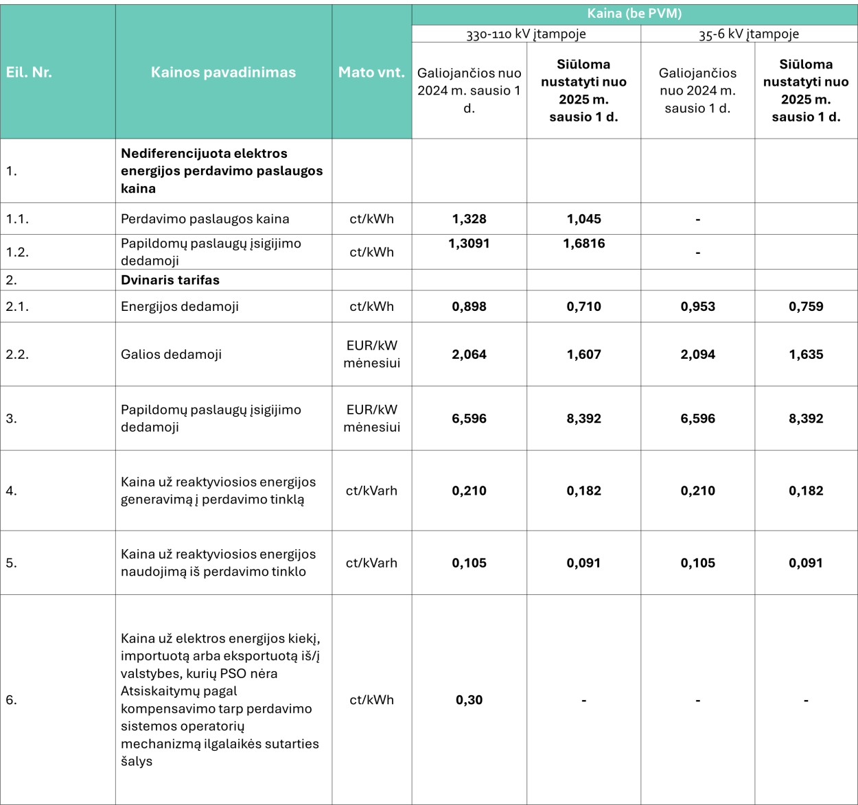 Valstybinė energetikos reguliavimo taryba (VERT), patikrinusi, ar LITGRID AB nustatydama elektros energijos perdavimo paslaugos kainas ir tarifus nepažeidė kainų ir tarifų nustatymo reikalavimų, ar nediskriminuojamos atskiros vartotojų grupės, pažeidimų nenustatė ir priėmė sprendimą skelbti LITGRID AB Elektros energijos perdavimo paslaugų kainas ir jų taikymo tvarką, galiosiančią nuo 2025 m. sausio 1 d.
