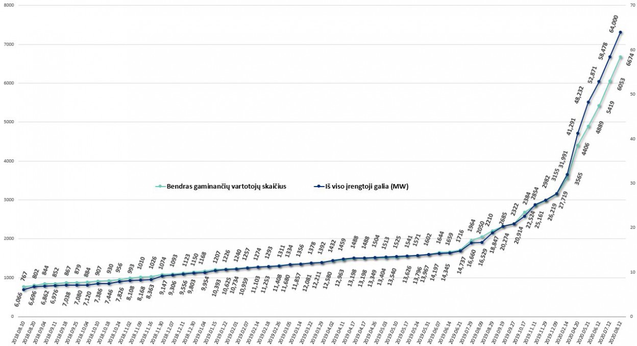 Daugėjant gaminančių vartotojų, atitinkamai auga ir elektrinių įrengtoji galia. Per metus (2019 m. rugpjūtis / 2020 m. rugpjūtis) bendra įrengtoji galia didėjo daugiau nei 3 kartus – nuo 18,847 MW iki 64,0 MW.