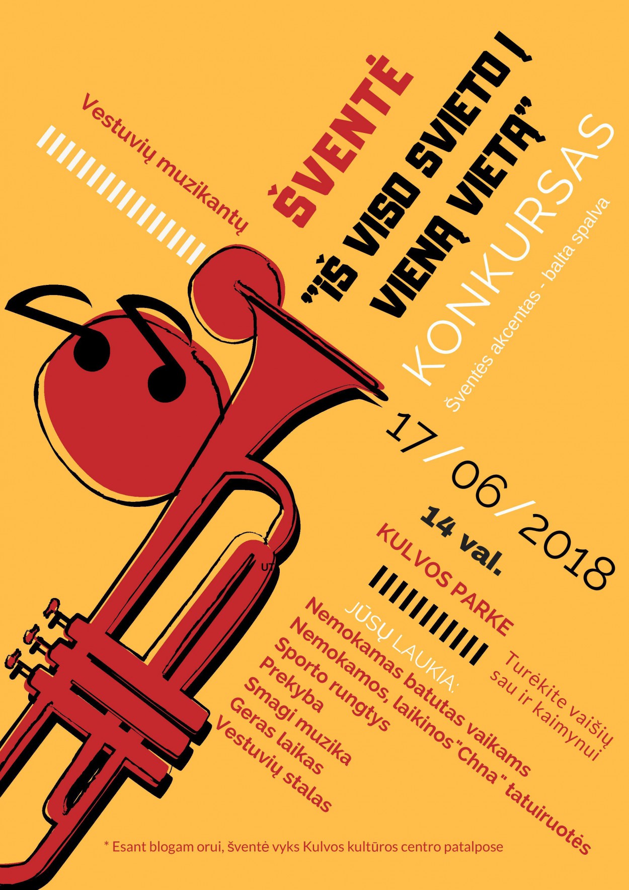 Visus kviečiame birželio 17 d. 14 val. į Kulvos parką, kur lauks ne tik konkursas ir smagios dainos, tačiau bus erdvė vaikams: nemokamas batutas ir nemokamos laikinos Chna tatuiruotės. Šventėje - konkurse taip pat bus galima įsigyti saldumynų ir suvenyrų, sudalyvauti sportinėse rungtyse. Visų susirinkusių laukia staigmenos, geras laikas, puiki muzika, o ką gali žinoti, galbūt ši šventė-konkursas padės kam nors susirasto savo būsimos šventės muzikantus? Visų laukiame, vietos užteks visiems!