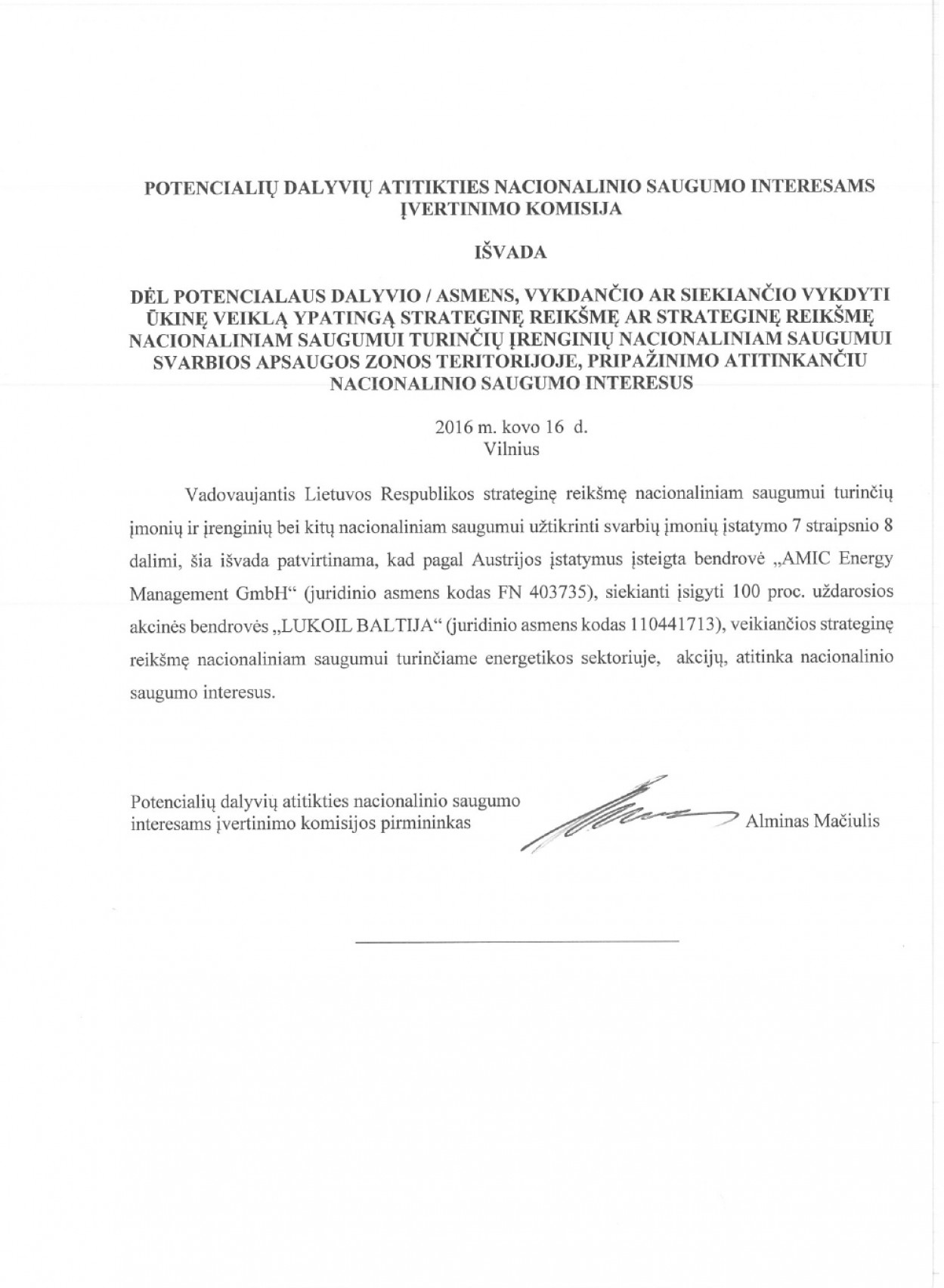 Komisijos išvadoje patvirtinta, kad 100 proc. „Lukoil Baltija“ akcijų ketinanti įsigyti „AMIC Energy“, veikianti strateginę reikšmę nacionaliniam saugumui turinčiame energetikos sektoriuje, atitinka Lietuvos nacionalinio saugumo interesus.