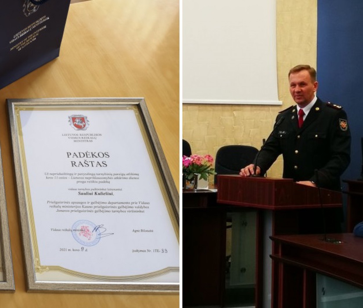 Vidaus reikalų ministrė (VRM) Agnė Bilotaitė nuotoliniu būdu už nepriekaištingą ir pavyzdingą tarnybinių pareigų atlikimą Kovo 11-osios – Lietuvos nepriklausomybės atkūrimo dienos proga apdovanojo labiausiai nusipelniusius vidaus reikalų sistemos pareigūnus, tarp jų ir 3 valstybinės priešgaisrinės gelbėjimo pareigūnus.