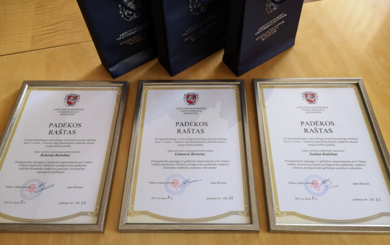 Padėkas vidaus reikalų ministrė pareiškė Kauno priešgaisrinės gelbėjimo valdybos Jonavos priešgaisrinės gelbėjimo tarnybos viršininkui vidaus tarnybos pulkininkui leitenantui Sauliui Kuliešiui, Vilniaus priešgaisrinės gelbėjimo valdybos skyrininkui vyresniajam puskarininkiui Liutaurui Bernotui ir Panevėžio priešgaisrinės gelbėjimo valdybos vyresniajam ugniagesiui gelbėtojui vyresniajam puskarininkiui Robertui Baltuškai.