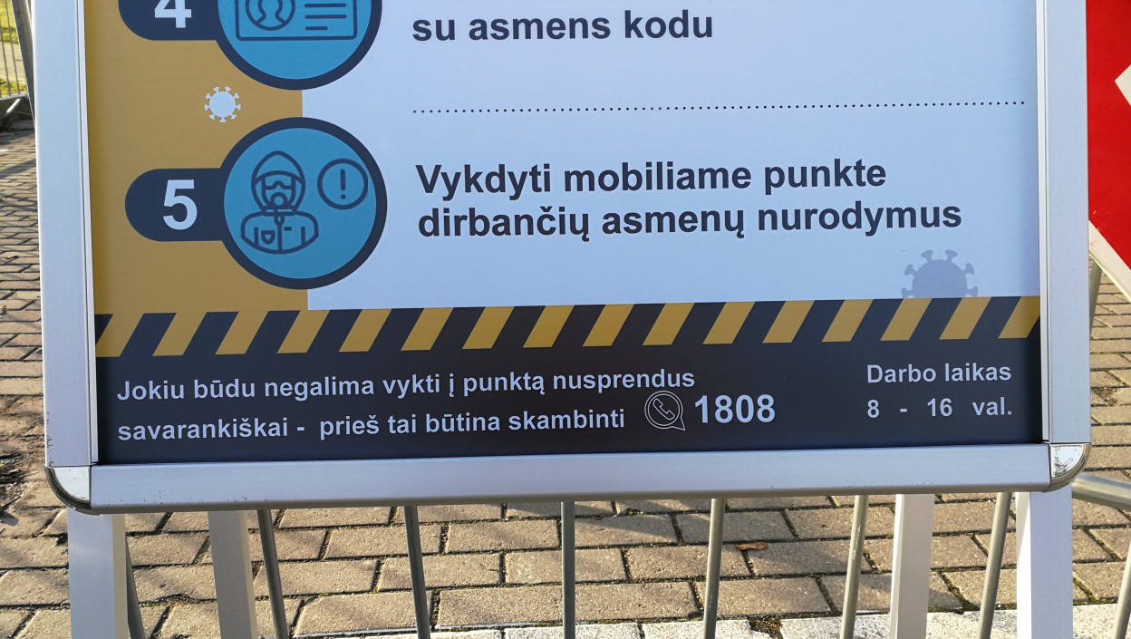 Primename, kad atvykusieji į mobilųjį punktą iš karto gali matyti ženklus ir elgesio taisykles, kuriose skelbiama, jog atvykus, nereikia lipti iš automobilio, neatidaryti langų iki kol negausite atskiro nurodymo, užrašytą savo mobiliojo telefono numerį reikia padėti matomoje vietoje, reikia pasiruošti dokumentą su asmens kodu, būtina vykdyti mobiliajame punkte dirbančių asmenų nurodymus.