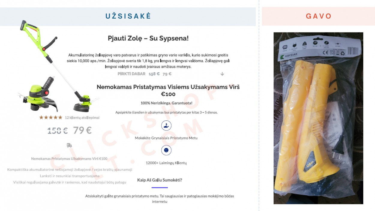 ClickShop-lt.com svetainėje vartotojas pasirinko apmokėjimą pristatymo metu. Kurjeriui pristačius prekę, vartotojui nekilo įtarimų, jog pakuotėje gali būti tik žaislinė „žoliapjovės“ versija, todėl sumokėjo sutartą sumą. Kurjeriui išvykus ir vartotojui išpakavus pakuotę, paaiškėjo, jog tai apgavystė.
