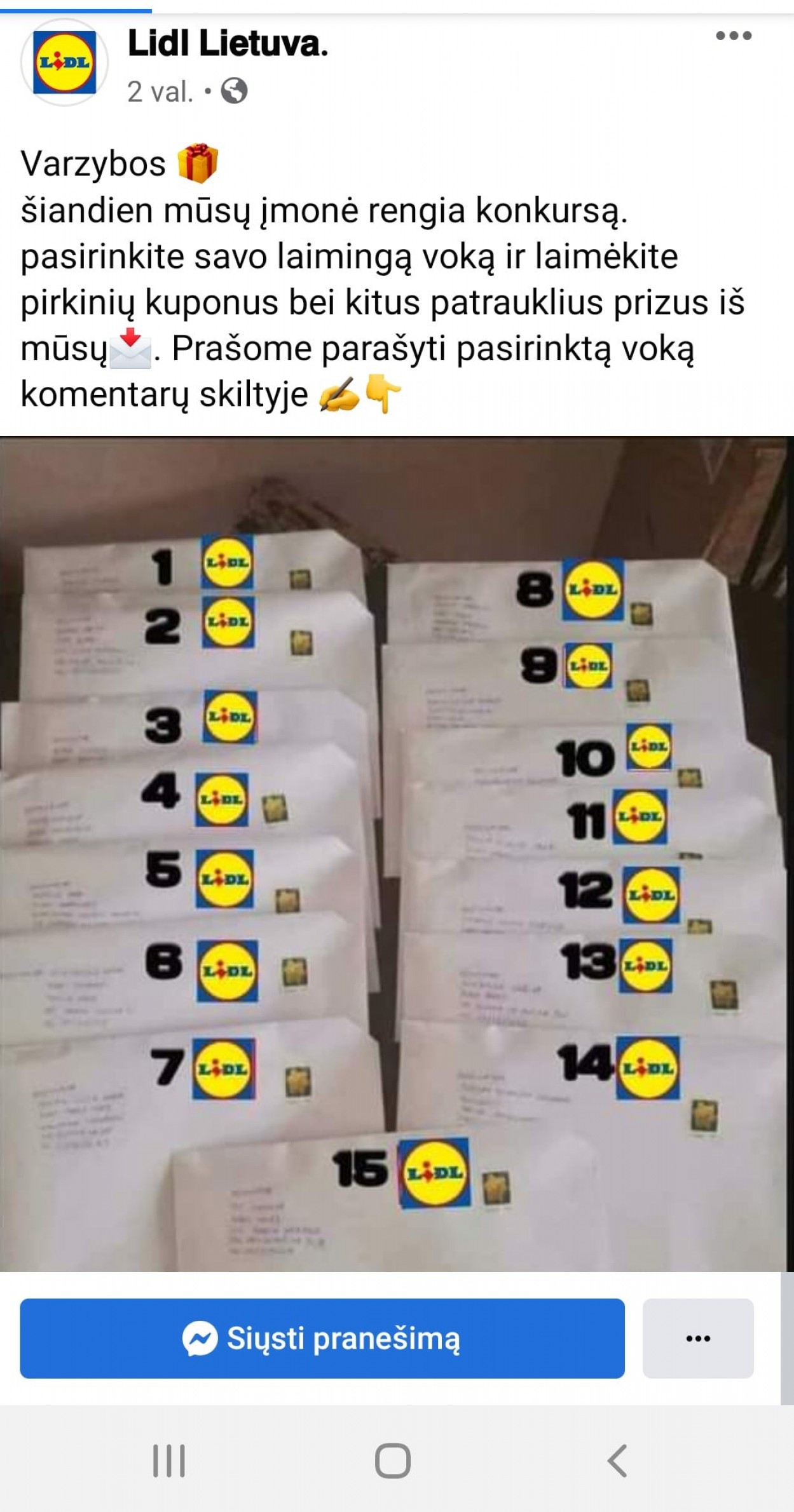 Šiuo metu sukčiai vėl intensyviai socialiniame tinkle „Facebook“ kuria vis naujus netikrus puslapius "Lidl Lietuva" vardu, kuriuose skelbia "konkursus". Primename jau anksčiau skelbtą informaciją apie konkursus socialiniuose tiksluose, rašoma virtualaus policijos patrulio ,,Facebook" paskyroje.