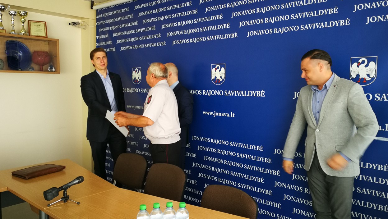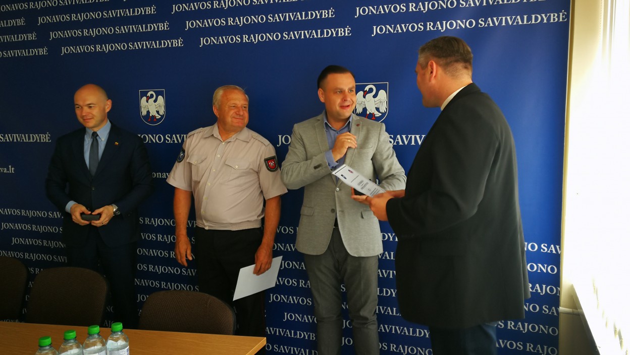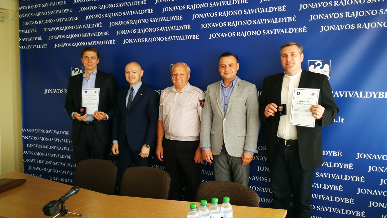 Ženklelius ir pažymėjimus jiems teikė Jonavos rajono ugniagesių savanorių draugijos pirmininkas Viktoras Kolesnikovas, meras Eugenijus Sabutis, vicemeras Erlandas Andrejevas .