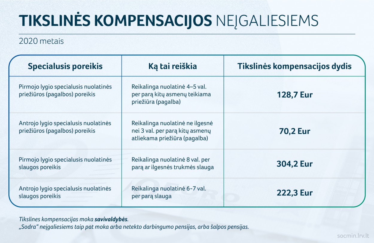 TIKSLINĖS KOMPENSACIJOS. Neįgaliesiems, kuriems nustatyti specialieji poreikiai, mokamos tikslinės kompensacijos. Jų dydis taip pat priklauso nuo bazės, o ji šiemet auga nuo 114 iki 117 eurų. Tai – papildoma išmoka, kuri gali būti mokama kartu su socialinio draudimo arba šalpos pensija. Tikslines kompensacijas gauna 93 tūkst. asmenų.