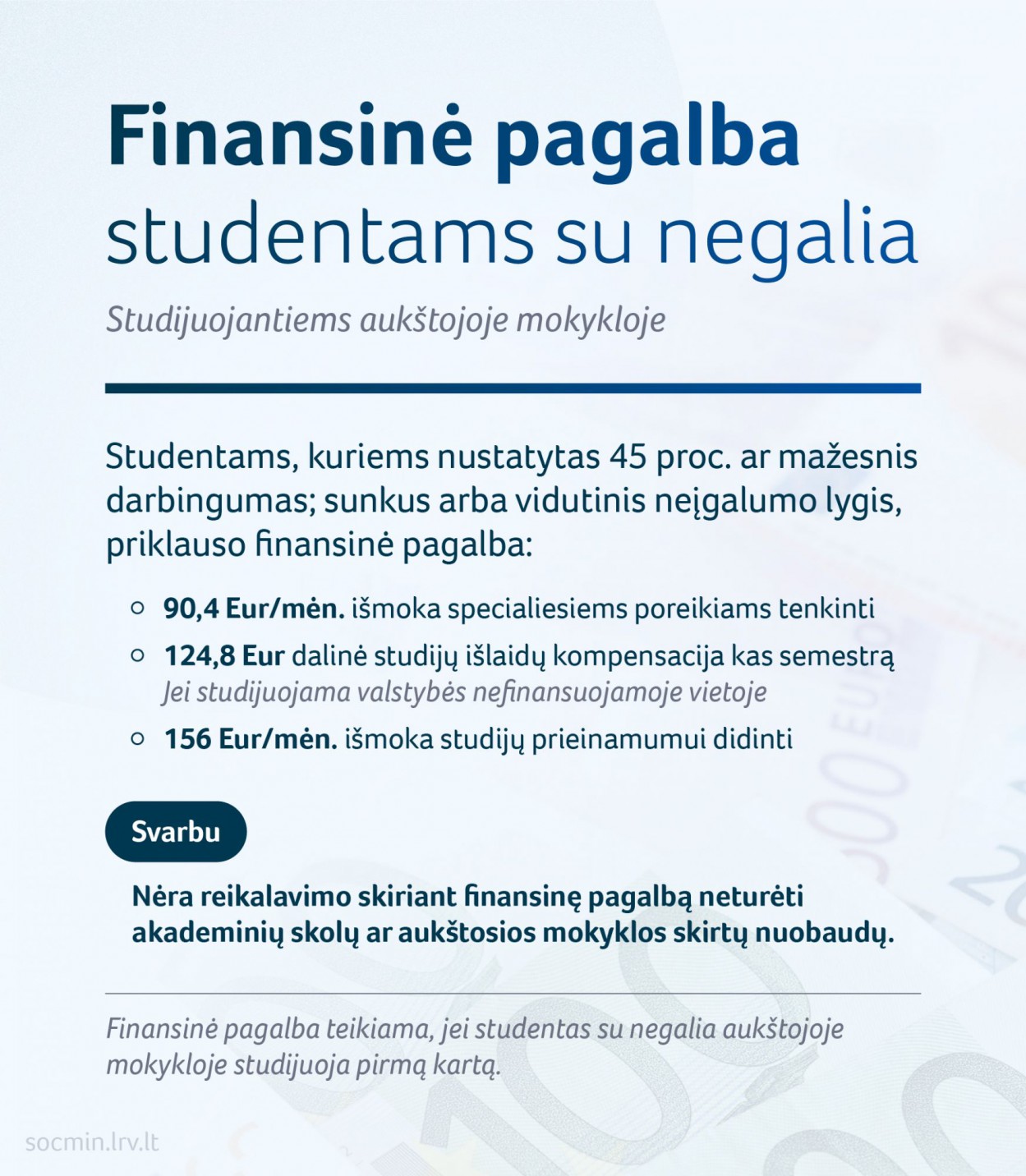 Studentams, kurie studijuoja aukštojoje mokykloje ir kuriems yra nustatytas 45 proc. ar mažesnis darbingumas, taip pat sunkus ar vidutinis neįgalumo lygis, priklauso finansinė pagalba – kas mėnesį mokama išmoka specialiesiems poreikiams tenkinti, iš dalies kompensuojamos studijų išlaidos (jei studentas studijuoja mokamoje vietoje) ir kas mėnesį mokama išmoka studijų prieinamumui didinti.