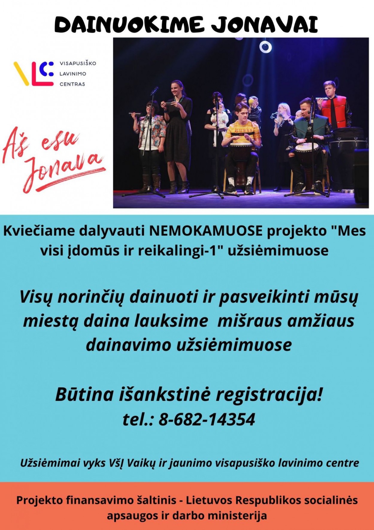Taipogi, VšĮ „Vaikų ir jaunimo visapusiško lavinimo centras“, visus norinčius dainuoti ir pasveikinti mūsų miestą daina, laukia mišraus amžiaus asmenų dainavimo užsiėmimuose „Dainuokime Jonavai“.