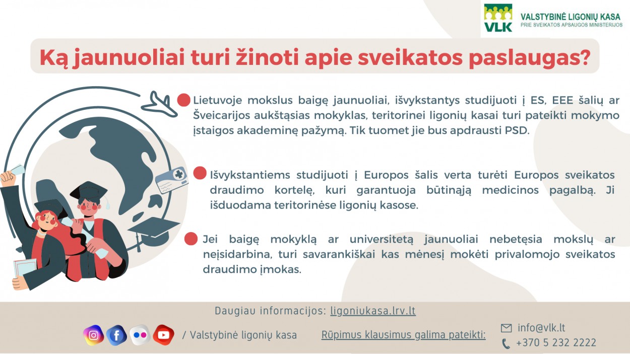 Ligonių kasų specialistai baigiantiems mokslus jaunuoliams primena, kad prasidėjęs naujas gyvenimo etapas atneša ir naujų įsipareigojimų: vienas iš jų – pasirūpinti savo privalomuoju sveikatos draudimu.