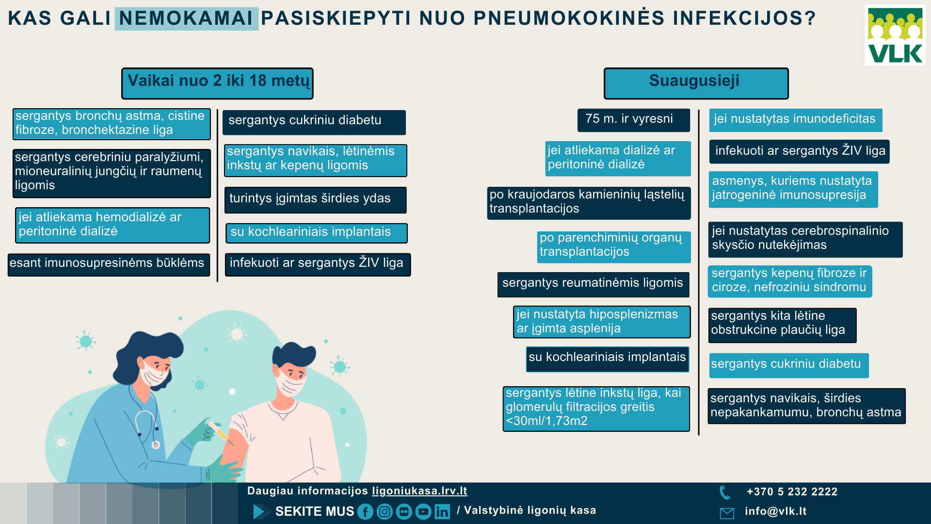 Ligonių kasos primena, kad Privalomojo sveikatos draudimo fondo lėšomis apmokama pneumokokinės infekcijos vakcina taip pat skiepijami sunkiomis lėtinėmis ligomis sergantys vaikai nuo 2 metų ir suaugusieji bei visi 75 metų ir vyresni gyventojai.